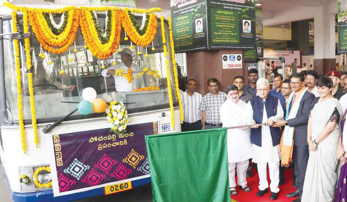 దేశంలో తొలిసారిగా ఆర్టీసీ బస్సులతో ”జీఐ ఆన్ వీల్స్”ను ప్రదర్శిస్తున్నట్టు రాష్ట్ర గవర్నర్ జిష్ణుదేవ్ వర్మ, రవాణా, బీసీ సంక్షేమ శాఖ మంత్రి పొన్నం ప్రభాకర్ అన్నారు. జీఐ హస్తకళలతో అలంకరించిన ప్రత్యేక బస్సులతో హైదరాబాద్ ఎంజీబీఎస్లో శుక్రవారం నిర్వహించిన జీఐ ఆన్ వీల్స్ కార్యక్రమంలో టీజీఎస్ఆర్టీసీ వైస్ చైర్మెన్ అండ్ ఎండీ నాగి రెడ్డి, హైదరాబాద్ జిల్లా కలెక్టర్ హరి చందన దాసరితో కలిసి గవర్నర్, మంత్రి జెండా ఊపి ప్రారంభించారు. ఈ సందర్భంగా గవర్నర్ మాట్లాడుతూ.. జీఐ గుర్తింపు పొందిన కళారూపాలపై ప్రజల్లో అవగాహన పెంపొందిం చడం, వాటిని ప్రాచుర్యంలోకి తీసుకురావడం ఈ కార్యక్రమం ముఖ్య ఉద్దేశమని తెలిపారు. రాష్ట్రంలో సాంస్కృతిక గుర్తింపును బలోపేతం చేసుకోవడం అవసరమని తెలిపారు. సంస్కృతి సమాజానికి ఆత్మస్వరూపమని, సాంస్కృతిక అవగాహన లేకుం డా సమాజం అభివృద్ధి సాధ్యం కాదన్నారు. ఈ తరహా కార్యక్రమాలు యువతలో సంప్రదాయ కళలపై ఆసక్తిని పెంచుతాయని, కళాకారులకు గౌరవాన్ని కల్పిస్తాయని తెలిపారు. మంత్రి మాట్లాడుతూ.. ఈ కార్యక్రమం గవర్నర్ దూరదృష్టి ఫలితమని తెలిపారు. జీఐ ఉత్పత్తుల ప్రాచుర్యం, మార్కెటింగ్ విస్తరణకు ప్రభుత్వం కట్టుబడి పనిచేస్తోందని చెప్పారు. ఈ చర్యలతో గ్రామీణ కళాకారులకు ఉపాధి అవకాశాలు పెరిగి, ఆర్థిక స్థితి మెరుగుపడుతుందని చెప్పారు. టీజీఎస్ ఆర్టీసీతో ఈ కార్యక్రమాన్ని విస్తృత స్థాయిలో అమలు చేయడానికి పూర్తి సహకారం అందిస్తా మని హామీ ఇచ్చారు. అదేవిధంగా పోచంపల్లి ఇక్కత్ వరంగల్, వరంగల్ తివాచీలు (కార్పెట్లు), కరీంనగర్ సిల్వర్ ఫిలిగ్రీ, నారాయణపేట్ చీరలు, చెరియల్ స్క్రోల్ పెయింటింగ్స్, నిర్మల్ పెయిం టింగ్స్ వంటి తెలంగాణకు చెందిన ఆరు ప్రముఖ జీఐ హస్తకళలను బస్సులపై ప్రత్యేకంగా ప్రతిష్టిం చారు. ఈ కళారూపాలు తెలంగాణ కళాకారుల నైపుణ్యానికి ప్రతీకలుగా నిలుస్తూ, ప్రజా రవాణాతో రాష్ట్రవ్యాప్తంగా విస్తృత ప్రచారం పొందనున్నాయ న్నారు. ప్రజారవాణా వ్యవస్థను సృజనాత్మక వేదికగా మలచి, తెలంగాణ సాంస్కృతిక వారసత్వా న్ని ప్రజలకు చేరవేయడం ఈ కార్యక్రమం ప్రధాన లక్ష్యమని తెలిపారు. టీజీఎస్ఆర్టీసీ వైస్ చైర్మెన్ అండ్ ఎండీ మాట్లాడుతూ.. బస్సులపై జీఐ కళా రూపాలను ప్రదర్శించడంతో సంస్కృతిని ప్రజలకు చేరువ చేయడంతో పాటు కళాకారులకు ప్రోత్సా హం అందించడమే లక్ష్యమని చెప్పారు. ఈ బస్సు లపై ప్రదర్శించిన డిజైన్లను జవహర్లాల్ నెహ్రూ ఆర్కిటెక్చర్ అండ్ ఫైన్ ఆర్ట్స్ యూనివర్సిటీ (జేఎన్ ఏఎఫ్ఏయూ) విద్యార్థులు రూపొందించారు. ఈ సందర్భంగా విద్యార్థులకు నగదు బహుమతులు, మెమొంటోలు అందజేశారు. జీఐ గుర్తింపుల సాధనలో సేవలందించిన సుభజిత్ సహాను ప్రత్యే కంగా సన్మానించారు. ఆరు జీఐ క