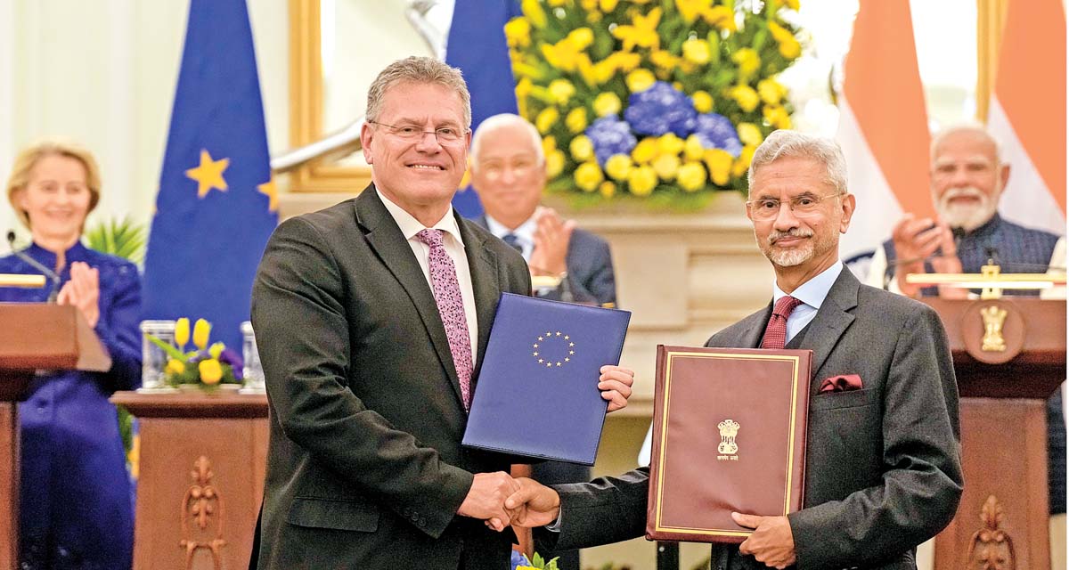 స్వేచ్ఛా వాణిజ్య ఒప్పందంపై చర్చలు ముగిసినట్లు సంయుక్త ప్రకటనపై వాణిజ్య శాఖ మంత్రి పీయూశ్ గోయల్, యురోపియన్ వాణిజ్య, ఆర్థిక భద్రతా వ్యవహారాల కమిషనర్ మార్కోస్ సెఫ్కొవిక్లు మంగళవారం సంతకాలు చేశారు. ప్రధాని నరేంద్ర మోడీ, ఇయు కమిషన్ అధ్యక్షురాలు ఉర్సులా వాన్ డెర్ లేయన్, యురోపియన్ కౌన్సిల్ అధ్యక్షుడు ఆంటానియో కోస్టాల సమక్షంలో ఈ సంతకాల కార్యక్రమం జరిగింది.