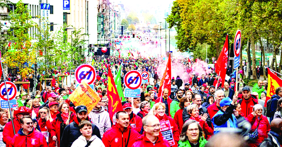బ్రస్సెల్స్‌ : బెల్జియంలో కార్మికులు మంగళవారం నిర్వహించిన జాతీయ సమ్మెతో దేశం స్తంభించిపోయింది. దేశంలో రవాణా, ప్రభుత్వ కార్యకలాపాలు నిలిచిపోయాయి. విమానాశ్రయాలను మూసేసారు. యూరప్‌లో రెండో అతిపెద్ద ఓడరేవు ఆంట్వెర్ప్‌లో షిప్పింగ్‌ ఆగిపోయింది. ప్రభుత్వ విధానాలకు వ్యతిరేకంగా ఎఫ్‌జిటిబి, ఎసివి, సిఎస్‌సి, ఎబివివి కార్మిక సంఘాలు ఈ జాతీయ సార్వత్రిక సమ్మెకు పిలుపునిచ్చాయి.. రాజధాని బ్రస్సెల్స్‌లో లక్షకు పైగా కార్మికులు భారీ ప్రదర్శనను నిర్వహించారు. మన హక్కుల కోసం.. మన పోరాటం అని నినదించారు. ఈ ర్యాలీని సెంట్రల్‌ స్టేషన్‌ వద్ద పోలీసులు అడ్డుకోవడంతో ఉద్రికత్తంగా మారింది. పోలీసులు వాటర్‌ ఫిరంగులు, టియర్‌ గ్యాస్‌ను ప్రయోగించారు. దీంతో అనేక మంది కార్మికులు గాయపడ్డారు. ప్రధానమంత్రి కార్యాలయాన్ని ముట్టడించేందుకు కార్మికులు ప్రయత్నించడంతో అనేక మందిని పోలీసులు అదుపులోకి తీసుకున్నారు. ఈ సమ్మెలో ఉపాద్యాయులు, విద్యార్థులు, జైళ్ల సిబ్బంది, పోస్టల్‌ కార్మికులు, నౌకా సిబ్బంది తదితరులు పాల్గొన్నారు.