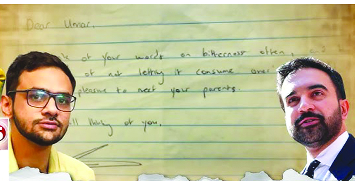 ఉమర్ ఖాలీద్కు న్యూయార్ మేయర్ జోహ్రాన్ మమ్దానీ స్వయంగా రాసిన నోట్లో ”చేదు అనుభవాల గురించి మీరు చెప్పిన మాటలను నేను తరచుగా ఆలోచిస్తూ వుంటాను. వీటి ప్రభావం మనలను ఆవరించకుండా చూసుకోవడం చాలా ముఖ్యం. మీ తల్లిదండ్రులను కలుసుకోవడం చాలా సంతోషంగా వుంది. మీ గురించే మేమందరం ఆలోచిస్తున్నాం” అని పేర్కొన్నారు. డిసెంబర్లో అమెరికాలో ఖాలీద్ తల్లిదండ్రులు పర్యటిస్తున్న సమయంలో వారిని కలుసుకున్న మమ్దానీ ఈ నోట్ను అందజేశారు. దాన్ని ఖాలీద్ భాగస్వామి బనోజ్యోత్స్న సోషల్మీడియాలో పోస్ట్ చేశారు. ”జైళ్లు మిమ్మల్ని ఏకాకులను చేయడానికి ప్రయత్నించినప్పుడు,మాటలు ప్రయాణిస్తాయి’ అని మమ్దానీ పేర్కొన్నారు.