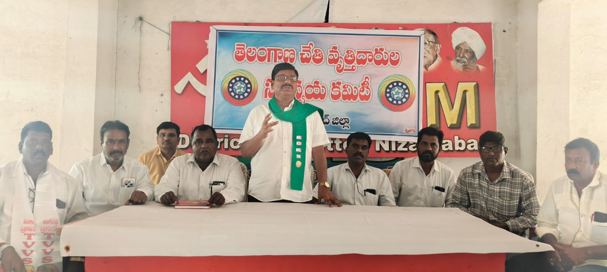 చేతివృత్తిదారుల సమన్వయ కమిటీ నిజామాబాద్ జిల్లా కేంద్ర కార్యాలయంలో సమావేశం శనివారం నిర్వహించారు. ఈ సమావేశానికి చేతి వృత్తిదారుల సమన్వయ కమిటీ ప్రారంభ నాయకులు పెద్ది వెంకట్రాములు అధ్యక్షత వహించగా రాష్ట్ర కన్వీనర్ ఎంవి రమణ, కమిటీ సభ్యులు ఉడుత రవీందర్, ఇడగొట్టి సాయిలు, ఎస్ రమేష్ గౌడ్, కామారెడ్డి సమన్వయ కమిటీ నాయకులు వెంకట్ గౌడ్, హాజరయ్యారు. అలాగే జిల్లాలోని వివిధ వృత్తి సంఘాల నాయకులు కోయడ నరసింహులు గౌడ్, కోటగిరి రామా గౌడ్, సుదర్శన్, సిదుగు శేఖర్ గౌడ్, రవి, అలాగే వడ్డెవర్దారుల సంఘం జిల్లా కార్యదర్శి ఇడగొట్టి వడ్డెన్న, సీనియర్ నాయకులు పి వెంకటేష్, మత్స్య కార్మిక సంఘం నాయకులు జి చంద్రకాంత్, విశ్వకర్మ సంఘం నాయకులు ఎన్ గోవర్ధన్, రజక సంఘం నాయకులు అభిమన్యు, సురేష్ తదితరులు పాల్గొన్నారు ఏ రమేష్, సిఐటియు జిల్లా ఉపాధ్యక్షులు ఏ రమేష్ బాబు లతోపాటు కెవిపిఎస్ జిల్లా అధ్యక్ష కార్యదర్శులు నల్వాల నరసయ్య, కొండ గంగాధర్లు పాల్గొన్నారు. ఈ సందర్భంగా రాష్ట్ర కన్వీనర్ ఎం వి రమణ మాట్లాడుతూ…కేంద్ర ప్రభుత్వం స్వదేశీ వస్తువులు వాడాలని ప్రకటించటం హర్షనీయం.