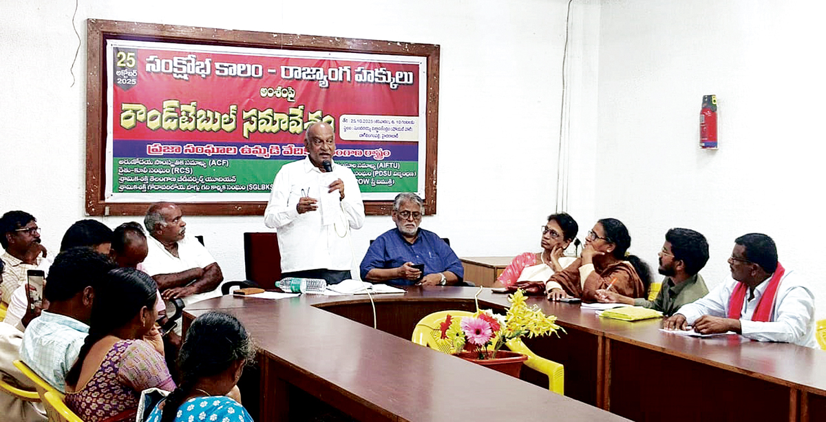 మావోయిస్టులపై ఆపరేషన్ కగార్ పేరుతో మానవ హననానికి పాల్పడటం సరైంది కాదని పలువురు వక్తలు అభిప్రాయపడ్డారు. ప్రజాసంఘాల ఉమ్మడి వేదిక ఆధ్వర్యంలో శనివారం హైదరాబాద్ బాగ్లింగంపల్లిలోని సుందరయ్య విజ్ఞాన కేంద్రం షోయబ్ హాల్లో ”సంక్షోభ కాలం రాజ్యాంగ హక్కులు” అనే అంశంపై రౌండ్ టేబుల్ సమావేశం నిర్వహించారు. వేదిక నాయకులు వంగాల సంతోష్, రైతు-కూలీ సంఘం రాష్ట్ర అధ్యక్ష, కార్యదర్శులు పట్లోళ్ల నాగిరెడ్డి, వెలుతురు సదానందంలు అధ్యక్ష వర్గంగా వ్యవహరించారు. ఈ సందర్భంగా సీపీఐ(ఎం) రాష్ట్ర కార్యదర్శివర్గ సభ్యులు అబ్బాస్ మాట్లాడుతూ.. కేంద్రంలోని బీజేపీ ప్రభుత్వం అనుసరిస్తున్న ఫాసిస్టు విధానాలను తీవ్రంగా ఖండించారు. పిడికెడు మంది కార్పొరేట్ శక్తుల ప్రయోజనాలు నెరవేర్చడానికి ఈ దేశ ప్రజలపై పాలకులు ఏకపక్షంగా కాల్పులకు తెగబడుతున్నారని ఆవేదన వ్యక్తం చేశారు. రాజ్యాంగం కల్పించిన మనిషి జీవించే హక్కును కాలరాయడాన్ని తీవ్రంగా ఖండిస్తున్నట్టు చెప్పారు. అరుణోదయ సాంస్కృతిక సమాఖ్య గౌరవ అధ్యక్షులు విమలక్క మాట్లాడుతూ.. దేశంలో బీజేపీ ప్రభుత్వ ఫాసిస్టు విధానాలకు వ్యతిరేకంగా అందరం ఐక్యమై పోరాడుదామని పిలుపునిచ్చారు. జస్టిస్(రిటైర్డ్) చంద్రకుమార్ మాట్లాడుతూ.. ప్రజలను హింసించి చంపితే, ప్రజాస్వామ్య మవు తుందా? అని ప్రశ్నించారు. సనాతన ధర్మం పేరుతో విద్యాలయాలను భ్రష్టు పట్టిస్తున్నారని ఆవేదన వ్యక్తం చేశారు. సీపీఐ రాష్ట్ర కార్యదర్శి కూనంనేని సాంబశివరావు తన సందేశాన్ని పంపగా వక్తలు చదివి వినిపించారు. ఈ సమా వేశంలో కాంగ్రెస్ ఎంపీ మల్లు రవి, ప్రొఫెసర్ కొండా నాగేశ్వరావు, కట్టా భగవంత్ రెడ్డి, ఎంసీపీఐ రాష్ట్ర నాయకులు మస్కుల మట్టయ్య, కాశం సత్యనారాయణ, ఆప్ నాయకులు సుధాకర్, ఏఐటీయూసీ నాయకులు బాల్రాజు, పరమేష్, టీపీడీఎఫ్ రాష్ట్ర నాయకులు ప్రకాష్, రైతు-కూలీ సంఘం రాష్ట్ర అధ్యక్షకార్యదర్శులు పట్లోళ్ల నాగిరెడ్డి, వెల్తురు సదానందం, నాయకులు వెంకటేశ్వర్ రావు, అరుణోదయ సాంస్కృతిక సమాఖ్య రాష్ట్ర అధ్యక్షకార్యదర్శులు మల్సూర్, పోతుల రమేష్, రాష్ట్ర సహాయ కార్యదర్శి రాకేష్, ఏఐఎఫ్టీయూ రాష్ట్ర అధ్యక్షులు మల్లేష్, రాష్ట్ర నాయకులు రాయమల్లు, వెంకట్ లక్ష్మి, అనసూయ తదితరులు పాల్గొన్నారు.