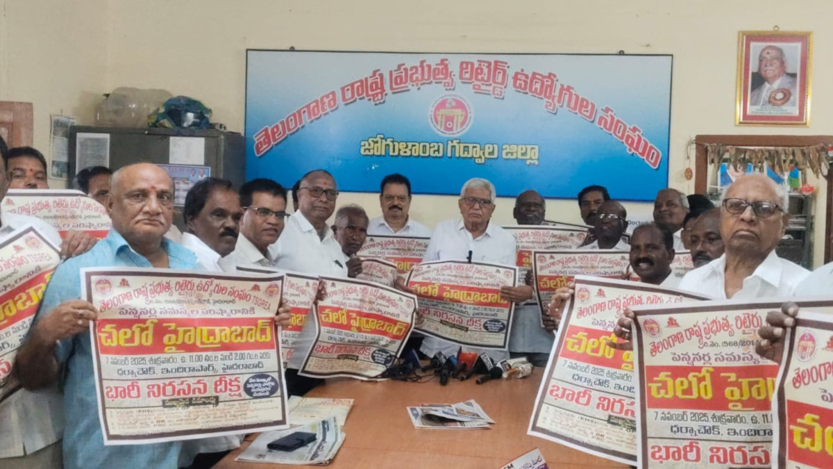 రిటైర్డ్ ఉద్యోగుల సమస్యల పరిష్కారానికి చలో హైదరాబాద్ కార్యక్రమాన్ని చేపట్టినట్లు ఆ సంఘం జిల్లా అధ్యక్షులు లక్ష్మిరెడ్డి తెలిపారు. మంగళవారం గద్వాల పట్టణం పాత హౌసింగ్ బోర్డు రిటైర్డ్ ఉద్యోగుల సంఘం కార్యాలయంలో  విలేకరుల సమావేశం ఏర్పాటు చేశారు. ఈ సందర్భంగా జిల్లా అధ్యక్షుడు ఎం.లక్ష్మీరెడ్డి, ప్రధాన కార్యదర్శి ఆర్.చక్రధర్  కోశాధికారి బీసిరెడ్డి మాట్లాడుతూ.. ప్రభుత్వ రిటైర్డ్ ఉద్యోగుల సమస్యల సాధనకై నవంబర్ 7న భారీ నిరసన దీక్ష చేపట్టినట్టు తెలిపారు.