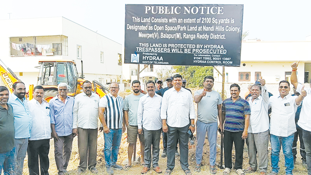 రంగారెడ్డి జిల్లా మీర్‌పేట్‌ నందిహిల్స్‌ కాలనీ రోడ్‌ నంబర్‌-8లో రూ.4 కోట్ల 20 లక్షల విలువైన 2100 గజాల పార్కు స్థలాన్ని హైడ్రా అధికారులు కాపాడారు.ఈ పార్కు స్థలంలో సుమారు 600 గజాలను ఓ పార్టీ నాయకుడు తప్పుడు పత్రాలు సృష్టించి అక్రమంగా కబ్జా చేసినట్టు కాలనీవాసులు గుర్తించారు. ఈ మేరకు కొందరు కాలనీవాసులు కాలనీ అసోసియేషన్‌ సభ్యులతో కలిసి హైడ్రా అధికారులకు ఫిర్యాదు చేశారు. దాంతో వారు స్పందించి ఆ స్థలంలో సర్వే నిర్వహించారు. కబ్జాకు గురైన పార్కు స్థలం చుట్టూ బుధవారం ఫెన్సింగ్‌ ఏర్పాటు చేసి, ఇది ప్రభుత్వ పార్కు స్థలం అని స్పష్టంగా పేర్కొంటూ బోర్డు పెట్టారు. హైడ్రా అధికారుల చర్యలతో కాలనీ వాసులు హర్షం వ్యక్తం చేశారు. ఈ సందర్భంగా హైడ్రా అధికారులు మాట్లాడుతూ.. ప్రభుత్వ భూములు, పార్కు స్థలాలు కబ్జా చేస్తే కఠిన చర్యలు తీసుకుంటమని, బాధ్యులపై క్రిమినల్‌ కేసులు నమోదు చేస్తామని హెచ్చరించారు.