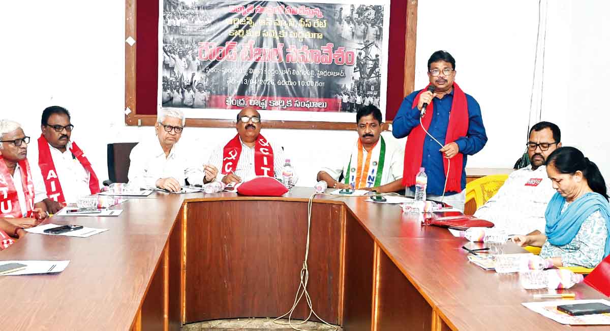 రౌండ్‌ టేబుల్‌ సమావేశంలో సీఐటీయూ రాష్ట్ర కోశాధికారి వంగూరు రాములు, రాష్ట్ర కార్యదర్శి కూరపాటి రమేష్‌, టీయూసీఐ రాష్ట్ర ప్రధాన కార్యదర్శి ఎస్‌ఎల్‌. పద్మ, టీయూసీఐ నగర అధ్యక్ష, ప్రధాన కార్యదర్శులు వి.ప్రవీణ్‌, ప్రదీప్‌, సీఐటీయూ రాష్ట్ర కమిటీ సభ్యులు యాటల సోమన్న, ఏఐయూటీయూసీ రాష్ట్ర కమిటీ సభ్యులు ఆంజనేయులు తదితరులు పాల్గొన్నారు. సీఐటీయూ రాష్ట్ర ఉపాధ్యక్షులు ఆర్‌. సుధాభాస్కర్‌ తీర్మానాన్ని ప్రవేశపెట్టగా అన్ని కార్మిక సంఘాలు బలపర్చాయి.