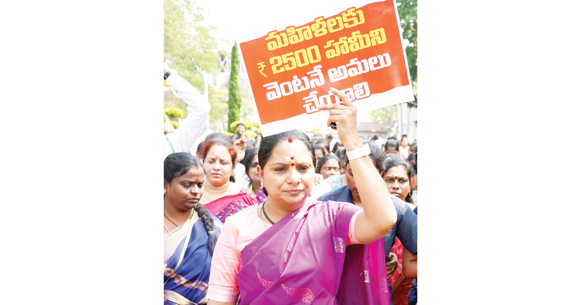 కాంగ్రెస్పార్టీ ఎన్నికల సమయంలో ఇచ్చిన హామీలను తక్షణం అమలు చేయాలని తెలంగాణ జాగృతి అధ్యక్షురాలు కల్వకుంట్ల కవిత డిమాండ్ చేశారు. మహిళలు, వృద్ధులు, వికలాంగులకు ఇచ్చే పింఛన్ల సొమ్మును పెంచాలనీ, మహిళల ఖాతాల్లో నెలకు రూ.2,500 జమ చేయాలనీ, విద్యార్థినులకు స్కూటీలు, తులం బంగారం ఇవ్వాలని కోరారు. మంగళవారం తెలంగాణ జాగృతి ఆధ్వర్యంలో మహిళలు పెద్ద సంఖ్యలో బేగంపేటలోని ప్రజాభవన్ ఎదుట రోడ్డుపై బైఠాయించి ఆందోళన నిర్వహించారు. ఎలాంటి ముందస్తు సమాచారం లేకపోవడంతో పోలీసులు హైరానా పడ్డారు. అప్పటికప్పుడు రోడ్డుపై బైఠాయించిన మహిళలు, విద్యార్థులకు అరెస్టులు చేసి, వేర్వేరు పోలీస్స్టేషన్లకు తరలించారు. తెలంగాణ జాగృతి అధ్యక్షురాలు కల్వకుంట్ల కవిత కూడా రోడ్డుపై బైటాయించి, ప్లకార్డులు ప్రదర్శిస్తూ ప్రభుత్వానికి వ్యతిరేకంగా నినాదాలు చేశారు.