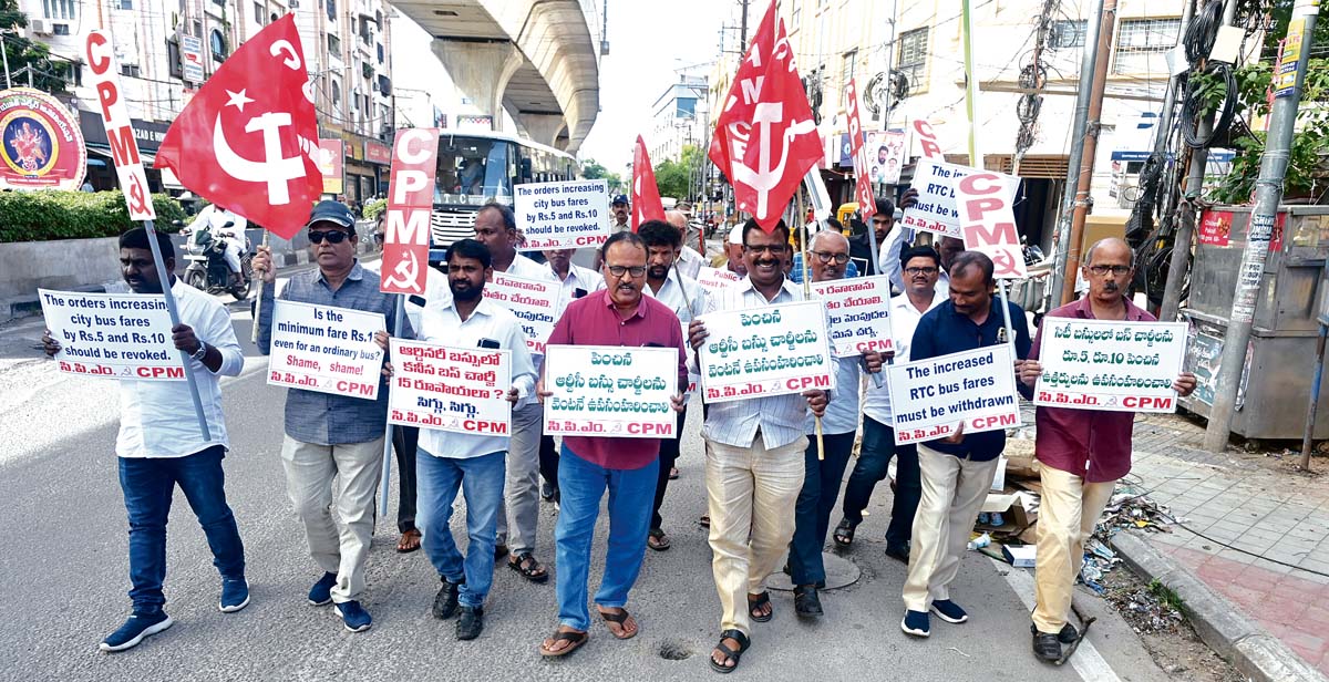 పెంచిన ఆర్టీసీ బస్సు చార్జీలను వెంటనే ఉపసంహరించాలని, ప్రజలపై భారాలు మోపుతున్న ప్రభుత్వ నిర్ణయాన్ని వెనక్కి తీసుకోవాలని సీపీఐ(ఎం) గ్రేటర్ హైదరాబాద్ సెంట్రల్ సిటీ కార్యదర్శి ఎం.వెంకటేష్ డిమాండ్ చేశారు. సోమవారం హైదరాబాద్ గోల్కొండ చౌరస్తా బస్టాప్ వద్ద పార్టీ గ్రేటర్ హైదరాబాద్ సెంట్రల్ సిటీ కమిటీ ఆధ్వర్యంలో నిరసన తెలిపారు. ఈ సందర్భంగా ఆయన మాట్లాడుతూ.. కొద్ది నెలల కిందటే ఆర్టీసీ బస్పాస్ ధరలను పెంచారని, ప్రస్తుతం బస్సు చార్జీల పెంపు నిర్ణయం అన్యాయమని అన్నారు. ప్రజానీకంపై భారాలు మోపే నిర్ణయాలు ప్రజా రవాణాను బలహీన పరుస్తాయని చెప్పారు. రాష్ట్ర ప్రభుత్వం క్రమంగా ఆర్టీసీ ప్రయివేటీకరణ చర్యలు చేపడుతున్నదన్నారు. ఇప్పటికే ఎలక్ట్రికల్ బస్సులను అద్దె బస్సులుగా మారుస్తూ ప్రయివేటు వ్యక్తులకు అప్పగిస్తూ నిర్ణయం తీసుకున్నారని అన్నారు. ప్రస్తుతం ఆర్టీసీ కార్గో సర్వీసులనూ ప్రయివేటు సంస్థలకు అప్పగించే చర్యలు కొనసాగుతున్నట్టు వార్తలు వస్తున్నాయన్నారు. ఇలాంటి ప్రయివేటీకరణ చర్యలను ఉపసంహరించి ఆర్టీసీ సంస్థను బలోపేతం చేయాలని డిమాండ్ చేశారు. మహిళల ఉచిత రవాణా ఫలితంగా ఆక్యుపెన్సీ రేషియో పెరిగింది కానీ దానికి అనుగుణంగా బస్సుల సంఖ్యను పెంచకపోవడంతో ప్రజలు తీవ్ర ఇబ్బందులకు గురవుతున్నారన్నారు. నగరంలో రద్దీకనుగుణంగా బస్సుల సంఖ్యను పెంచాలని విజ్ఞప్తి చేశారు. పెంచిన ఆర్టీసీ చార్జీలను వెంటనే ఉపసంహరించుకునేలా చర్యలు తీసుకోవాలని ప్రభుత్వాన్ని కోరారు. ఈ కార్యక్రమంలో సీపీఐ(ఎం) రాష్ట్ర కమిటీ సభ్యులు ఆర్.అరుణ జ్యోతి, నగర కార్యదర్శివర్గ సభ్యులు ఎం.శ్రీనివాసరావు, ఎం.దశరథ్, ఎం.మహేందర్, నాయకులు ఆర్.వెంకటేష్, జి.నరేష్, ఎం.అజరు బాబు, ఎన్.మారన్న, జి.కిరణ్ పాల్గొన్నారు.