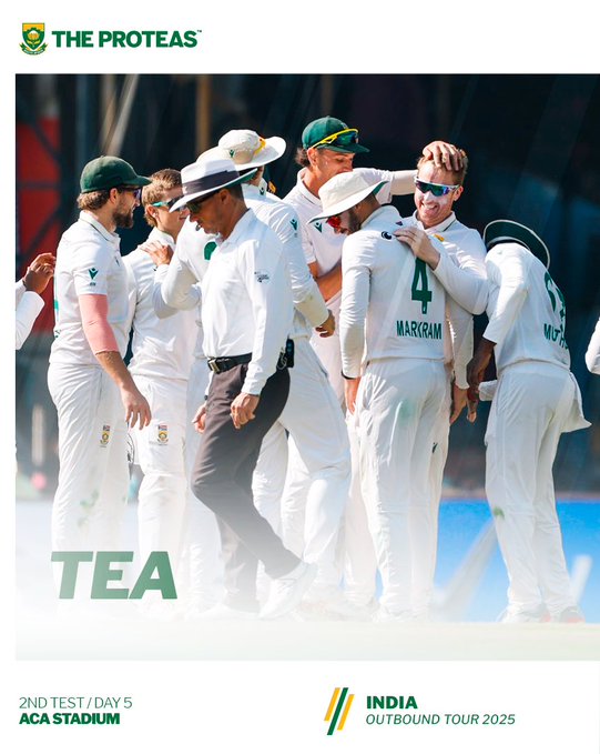 న‌వ‌తెలంగాణ‌-హైద‌రాబాద్ : ద‌క్షిణాఫ్రికాతో జ‌రుగుతున్న రెండో టెస్టులో ఇండియా ఓట‌మి అంచున ఉన్న‌ది. అయిదో రోజు భార‌త టాప్ ఆర్డ‌ర్ బ్యాట‌ర్లు త‌డ‌బ‌డ్డారు. టీ బ్రేక్ స‌మ‌యానికి ఇండియా 47 ఓవ‌ర్ల‌లో 5 వికెట్లు కోల్పోయి 90 ర‌న్స్ చేసింది. ఇవాళ తొలి సెష‌న్‌లో 31 ఓవ‌ర్లు బౌలింగ్ చేశారు. స్పిన్న‌ర్ హార్మ‌ర్ త‌న ఖాతాలో నాలుగు వికెట్లు వేసుకున్నాడు. 549 ర‌న్స్ టార్గెట్‌తో బ‌రిలోకి దిగిన ఇండియా.. ఇంకా 459 ర‌న్స్ వెనుక‌బ‌డి ఉన్న‌ది. ఒక‌వేళ ఇండియా ఈ మ్యాచ్‌లో ఓడిపోతే, అప్పుడు టెస్టు సిరీస్‌ను 2-0 తేడాతో కోల్పోవాల్సి వ‌స్తుంది. ప్ర‌స్తుతం క్రీజ్‌లో సాయి సుద‌ర్శ‌న్‌, జ‌డేజా ఉన్నారు. ఇద్ద‌రూ త‌మ డిఫెన్స్ టెక్నిక్ ప్ర‌ద‌ర్శిస్తున్నారు. సాయి సుద‌ర్శ‌న్ 138 బంతుల్లో 14 ర‌న్స్ చేశాడు. ఇండియ‌న్ బ్యాట‌ర్ల‌లో కుల్దీప్ యాద‌వ్ 5, ద్రువ్ జురెల్ 2, రిష‌బ్ పంత్ 13 ర‌న్స్ చేసి ఔట‌య్యారు.