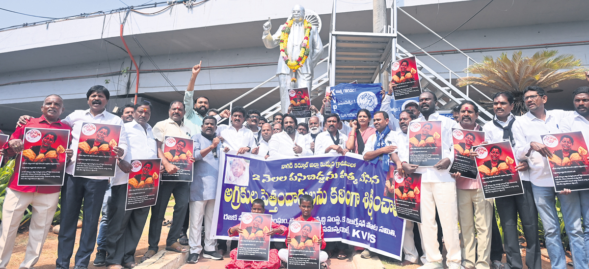 నాగర్ కర్నూల్ జిల్లా కుమ్మెర గ్రామంలో రెండు నెల్ల పసిబిడ్డను అమానవీయంగా కాలితో తన్ని హత్య చేసిన దురహంకారులను కఠినంగా శిక్షించాలని రజక సామాజిక, ప్రజాసంఘాలు డిమాండ్ చేశాయి. మంగళవారం హైదరాబాద్లోని లోయర్ ట్యాంక్బండ్లోని అంబేద్కర్ విగ్రహం వద్ద నిరసన కార్యక్రమాన్ని చేపట్టారు. అగ్రకుల పెత్తందారులు శ్రీనివాస్రెడ్డి, మధుసూదన్రెడ్డి, సతీష్రెడ్డి, శ్రీకాంత్రెడ్డి, కన్నిరెడ్డి, తుకారంరెడ్డి మరికొందరిపై ఎస్సీ ఎస్టీ అత్యాచార నిరోధక చట్టంతోపాటు హత్యా నేరం కింద కేసు నమోదు చేయాలని ఈ సందర్భంగా డిమాండ్ చేశారు.ఎనిమిది మంది హంతకులను 24 గంటల్లో తక్షణమే రిమాండ్ చేయాలని లేదంటే రజక సామాజిక, ప్రజాసంఘాల ఆధ్వర్యంలో అసెంబ్లీ సమావేశాల సందర్భంగా ఆందోళన చేపడతామని హెచ్చరించారు. రజక వృత్తి దారుల సంఘం రాష్ట్ర ప్రధాన కార్యదర్శి పైళ్ల ఆశయ్య అధ్యక్షతన జరిగిన సభలో రజక అభివృద్ధి సంస్థ రాష్ట్ర చైర్మెన్ బొమ్మరాజు కృష్ణ మూర్తి, ఎం నరసింహ, కేవీపీఎస్ రాష్ట్ర ప్రధాన కార్యదర్శి టీ స్కైలాబ్ బాబు, రజక రిజర్వేషన్ సమితి రాష్ట్ర అధ్యక్షులు గోపి రజక, రజక అభివృద్ధి సంస్థ రాష్ట్ర ప్రధాన కార్యదర్శి జూపల్లి రాజశేఖర్, రజక వృత్తిదారుల సంఘం రాష్ట్ర అధ్యక్షులు ఎదునూరి మదార్ రజక, జాగృతి రాష్ట్ర అధ్యక్షులు బాలాపూర్ బాలారాజ్, ఐద్వా రాష్ట్ర ప్రధాన కార్యదర్శి మల్లు లక్ష్మి, డీవైఎఫ్ఐ రాష్ట్ర అధ్యక్ష, కార్యదర్శులు కోటా రమేష్, అనగంటి వెంకటేష్ ప్రసంగించారు. పండగలు ఉత్సవాల్లో అగ్రకుల దురహంకారంతో ప్రజల మధ్య కులవిద్వేషాలు సష్టించడమేంటని ప్రశ్నించారు. దేవుని దగ్గరికి వెళ్లడానికి రూ. వంద ఫీజు ఎందుకు చెల్లించాలని ప్రశ్నించిన పాపానికి ఈ ఘాతుకానికి పాల్పడ్డారని ఆవేదన వ్యక్తం చేశారు. చెల్లించిన డబ్బులకు రషీదు అడగటం నేరమా? అని ప్రశ్నించారు. ప్రశ్నించినందుకు మూడున్నర గంటలపాటు గణేష్ అనే రజక యువకుడిని చితక బాధారని ఆగ్రహాన్ని వ్యక్తం చేశారు. తన భర్తను కొట్టొవద్దనీ, తమ్ముడిని కొట్టవద్దని గణేష్ అక్క కీర్తి, భార్య మౌనిక ఎంతగా బ్రతిమిలాడినా.. కాళ్లు మొక్కడానికి ప్రయత్నం చేసినా దుర్మార్గులు కాళ్లతో తన్నారని ఆవేదన వ్యక్తం చేశారు. చివరికి రెండు నెల్ల పసిబిడ్డను అమానవీయంగా హత్య చేశారని చెప్పారు. ఈ ఘటన పట్ల పోలీసుల పాత్ర నిందితులకు అనుకూలంగా ఉందని విమర్శించారు. బాధితులే అగ్రకుల పెత్తందారులపైన దాడి చేసినట్టుగా బాధితులపై కేసులు నమోదు చేయడం సిగ్గుచేటని ఆగ్రహాన్ని వ్యక్తం చేశారు.సీఎం సొంత జిల్లాలో ఈ ఘటన జరిగితే సీఎం ఎందుకు మౌనంగా ఉన్నారని ప్రశ్నించారు. కార్యక్రమంలో ఐద్వా రాష్ట్ర ఉపాధ్యక్షురాలు కే ఎన్ ఆశాలత, కేవీపీఎస్ నగర కార్యదర్శి బి సుబ్బారావు, టీపీఎల్ఎఫ్ ఉప