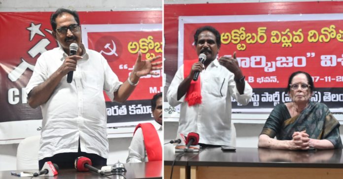 నవతెలంగాణ – హైదరాబాద్: శాంతి, అందరికీ భూమి, ఆహారం హామీలను నెరవేర్చిన సోవియట్ యూనియన్ అక్టోబర్ విప్లవం సమాజంలో వినూత్న మార్పును తీసుకొచ్చిందనీ, దోపిడీ, పీడన లేని సమాజం సాధ్యమేనని చూపెట్టినదని మహోత్తర పోరాటం అది అని సీపీఐ(ఎం) కేంద్ర కమిటీ సభ్యులు తమ్మినేని వీరభ్రదం కొనియాడారు. అక్టోబర్ విప్లవ దినోత్సవానికి నవంబర్ ఏడో తేదీన జరుపుకోవడానికి గ్రిగేరియన్ క్యాలెండర్ కారణమన్నారు. శుక్రవారం హైదరాబాద్లోని సీపీఐ(ఎం) రాష్ట్ర కార్యాలయం(ఎంబీ.భవన్)లో ఆ పార్టీ కేంద్ర కమిటీ సభ్యులు టి. జ్యోతి అధ్యక్షతన అక్టోబర్ విప్లవం-విశిష్టత అనే అంశంపై సెమినార్ నిర్వహించారు. ఈ సందర్భంగా తమ్మినేని మాట్లాడుతూ.. లెనిన్ నేతృత్వంలోని బోల్షివిక్ పార్టీ, బూర్జువాలు కలిసి రష్యాలో జార్ చ్రకవర్తుల పాలనను కూలదోసి ఫిబ్రవరి 17న ప్రజాప్రభుత్వాన్ని ఏర్పాటు చేశారని తెలిపారు. అయితే, ప్రజలు ఆశించిన విధంగా యుద్ధాల నుంచి విముక్తి, రైతులకు భూమి, అందరికీ రేషన్ అందించేందుకు బూర్జువాలు సిద్ధంగా లేకపోవడంతో ప్రజల సహకారంతో అక్టోబర్ విప్లవం ద్వారా లెనిన్ నాయకత్వంలో రష్యాలో సోషలిస్టు ప్రభుత్వం ఏర్పడిందని గుర్తుచేశారు. - ఆ ప్రభుత్వం యుద్ధాల నుంచి శాంతి కలిగించి పేదలకు భూములను పంచిందనీ, అందరికీ రేషన్, సంక్షేమం అందించిందని వివరించారు. స్థానిక ప్రభుత్వాలకు అధికారాలివ్వటం, ప్రజల ఆకాంక్షలకు అనుగుణంగా పాలన సాగడంతో లెనిన్ ప్రభుత్వం పట్ల విశ్వసనీయత పెరిగిందన్నారు. ఓవైపు రష్యాలో జాతుల మధ్య ఐక్యత కోసం సిద్ధాంతాన్ని రూపొందించడంతోనే ఆ తర్వాత కాలంలో సోవియట్ రష్యా ఏర్పడిందన్నారు. అదే సమయంలో జర్మనీతో వ్యూహాత్మక సంధి చేసుకుందని తెలిపారు. 70 ఏండ్లపాటు రష్యా సోషలిస్టు ప్రభుత్వం ప్రపంచానికి ప్రత్యామ్నాయ పాలన అందించిందన్నారు. ఆ 70 ఏండ్లలో అనేక దేశాల నేతలు సోషలిస్టు భావజాలం వైపు మొగ్గు చూపారని తెలిపారు. ఆ తర్వాత కాలంలో వచ్చిన పాలకులు తీసుకున్న విధానాలతో 1989-90 సోషలిస్టు వ్యవస్థ కూలిపోయిందన్నారు. దీంతో కమ్యూనిస్టుల పని అయిపోయిందనీ, పెట్టుబడి దారీ వ్యవస్థలోనూ ప్రజల సంక్షేమం ఉందని ప్రచారాన్ని కొన్న శక్తలు చేపట్టాయన్నారు.