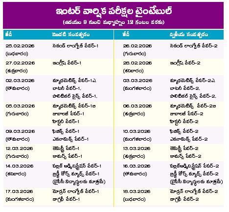 రాష్ట్రంలో ఇంటర్మీడియట్ ప్రథమ, ద్వితీయ సంవత్సరం విద్యార్థుల వార్షిక పరీక్షలు వచ్చే ఏడాది ఫిబ్రవరి 25నుంచి ప్రారంభమవుతాయి. ఈ పరీక్షలు మార్చి 18 వరకు జరుగుతాయి. జనరల్తోపాటు ఒకేషనల్ విద్యార్థులకూ ఇదే షెడ్యూల్ వర్తించనుంది. ఇంటర్ ప్రథమ సంవత్సరం పరీక్షలు ఫిబ్రవరి 25 నుంచి మార్చి 17 వరకు, ద్వితీయ సంవత్సరం పరీక్షలు ఫిబ్రవరి 26 నుంచి మార్చి 18 వరకు జరుగుతాయి. ఈ మేరకు ఇంటర్ బోర్డు కార్యదర్శి ఎస్ కృష్ణ ఆదిత్య శుక్రవారం ఇంటర్ వార్షిక పరీక్షల షెడ్యూల్ (టైంటేబుల్)ను విడుదల చేశారు. ఫిబ్రవరి 25 నుంచి మార్చి 18 వరకు జరిగే ఇంటర్ పరీక్షలను ఉదయం తొమ్మిది నుంచి మధ్యాహ్నం 12 గంటల వరకు నిర్వహిస్తామని తెలిపారు.