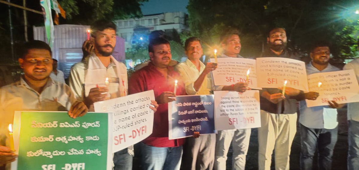 హర్యానాలో పోలీసు ఉన్నతాధికారి, అడిషనల్ డిజి కె.పూరన్ కుమార్ ఆత్మహత్య ముమ్మాటికీ ప్రభుత్వ హత్యేనని, దానిపై స్వతంత్ర జడ్జితో విచారణ జరిపించాలని ఎస్ఎఫ్ఐ, డీవైఎఫ్ఐ రాష్ట్ర నేతలు డిమాండ్ చేశారు. బీజేపీ పాలిత రాష్ట్రాల్లో ఉన్నత ఉద్యోగాలలో, విద్యాసంస్థలలో దళితులపై, అణగారిన వర్గాలపై దాడులు నిత్యకృత్యమయ్యాయని, వాటిని అరికట్టాలని కోరారు. ఎస్ఎఫ్ఐ, డీవైఎఫ్ఐ ఆధ్వర్యంలో హైదరాబాద్ బాగ్లింగంపల్లిలోని సుందరయ్య విజ్ఞాన కేంద్రం వద్ద సోమవారం సాయంత్రం కొవ్వొత్తులతో ప్రదర్శన చేసి పూరన్కుమార్కు జోహార్లు అర్పించారు. అనంతరం రాష్ట్ర అధ్యక్ష, ప్రధాన కార్యదర్శులు ఎస్.రజనీకాంత్, టి.నాగరాజు మాట్లాడుతూ.. దేశంలో బీజేపీ పాలనలో అణగారిన వర్గాలపై దాడులు తీవ్రమయ్యాయని, అమాయకులు ప్రాణం కోల్పోతున్నారని ఆవేదన వ్యక్తం చేశారు. ఉన్నత విద్యాసంస్థలో రోహిత్ వేముల, నేడు పోలీసు శాఖలో అత్యున్నత స్థాయి అడిషనల్ డీజీ స్థాయి ఉద్యోగి ఆత్మహత్య చేసుకునేలా వేధింపులకు గురిచేశారని అన్నారు. ఇది ఆత్మహత్య కాదని ప్రభుత్వ హత్యే అని అన్నారు. డీవైఎఫ్ఐ రాష్ట్ర ప్రధాన కార్యదర్శి ఆనగంటి వెంకటేష్ మాట్లాడుతూ.. గతంలో అనేక సందర్భాల్లో కూడా పూరన్ కులవివక్ష ఎదుర్కొన్నారని, ప్రభుత్వానికి అనేక సందర్భాల్లో రిపోర్టు చేసినా పట్టించుకోలేదని అన్నారు. అందుకే దేశంలో అణగారిన వర్గాల రక్షణ కోసం ప్రత్యేక చట్టం చేయాలని డిమాండ్ చేశారు. ఈ కార్యక్రమంలో డీవైఎఫ్ఐ రాష్ట్ర అధ్యక్షులు కోట రమేష్, ఎస్ఎఫ్ఐ రాష్ట్ర ఉపాధ్యక్షులు డి.కిరణ్, డీవైఎఫ్ఐ రాష్ట్ర ఉపాధ్యక్షులు ఎం.డి.జావేద్, టీపీటీఎల్ఎఫ్ రాష్ట్ర అధ్యక్షులు ఎ.విజరు కుమార్, రాష్ట్ర ఉపాధ్యక్షులు కె.విజరు, ఎస్ఎఫ్ఐ హైదరాబాద్ జిల్లా అధ్యక్షులు లెనిన్, నాయకులు నాగేందర్, రజనీకాంత్, కైలాష్, భరత్, ప్రవీణ్, డీవైఎఫ్ఐ నాయకులు రాజు, పాటల గోపి తదితరులు పాల్గొన్నారు.