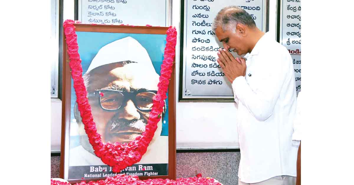 హైదరాబాద్లోని బీఆర్ఎస్ పార్టీ రాష్ట్ర కార్యాలయం తెలంగాణ భవన్లో మాజీ ఉపప్రధాని బాబు జగ్జీవన్ రామ్ జయంతి వేడుకలు ఆదివారం ఘనంగా జరిగాయి. ఈ సందర్భంగా ఆయన చిత్ర పటానికి బీఆర్ఎస్ఎల్పీ ఉపనేత, మాజీమంత్రి టి హరీశ్రావు, మాజీ మంత్రులు సబితా ఇంద్రారెడ్డి, కొప్పుల ఈశ్వర్, మాజీ ఎంపీ రావుల చంద్రశేఖర్రెడ్డి, ఎమ్మెల్సీ దాసోజు శ్రవణ్, బీఆర్ఎస్ ప్రధాన కార్యదర్శి ఆర్ఎస్ ప్రవీణ్ కుమార్ తదితరులు పూలమాలవేసి నివాళులర్పించారు. దేశానికి ఆయన చేసిన సేవలను, అణగారిన వర్గాల అభివృద్ధి కోసం పాటుపడ్డ విషయాలను వారు స్మరించుకున్నారు. ఈ కార్యక్రమంలో మాజీ ఎమ్మెల్యే పట్ల శశిధర్ రెడ్డి, కార్పొరేషన్ మాజీ చైర్మెన్ ఎర్రోళ్ల శ్రీనివాస్, బీసీ కమిషన్ మాజీ సభ్యులు ఉపేందర్, కె కిషోర్గౌడ్, జెడ్పీ మాజీ చైర్మెన్ తుల ఉమ, మహిళా నాయకురాలు సుమిత్ర, బీఆర్ఎస్వీ రాష్ట్ర ఉపాధ్యక్షులు తుంగ బాలు, విద్యార్థి నాయకులు హరిబాబు, అమరేందర్ తదితరులు పాల్గొన్నారు.