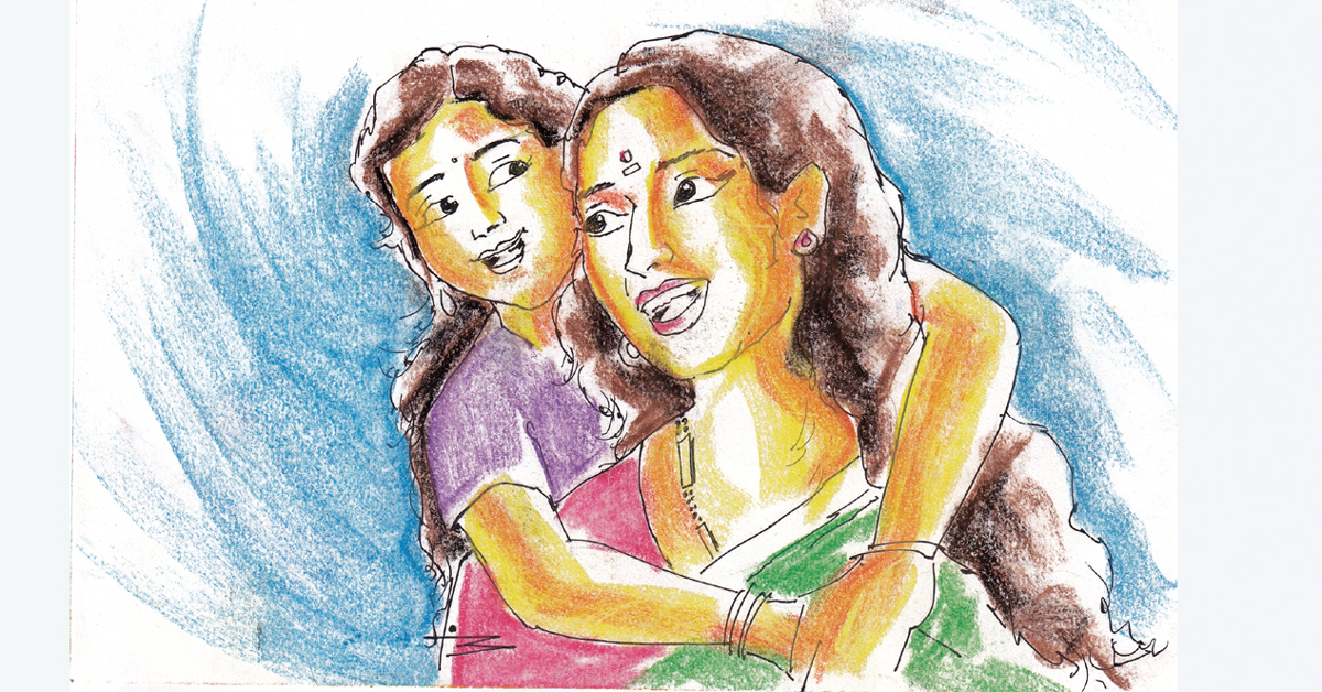 ”మా మంచి మమ్మీ…” అని బుగ్గన ముద్దు పెట్టింది. తరువాత ”నాదో సందేహమమ్మా. వాళ్లలా ఎందుకున్నారు?మన మెందుకిలా ఉన్నాం?” సందేహంగా అడిగింది.