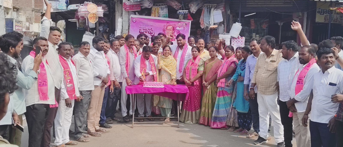 పట్టణంలోని ప్రధాన కూడలి అయిన బస్టాండ్ సెంటర్ వద్ద పార్టీ నాయకులు భారీ కేక్ కట్ చేసి కేసీఆర్ కి జన్మదిన శుభాకాంక్షలు తెలిపారు. ఒకరికొకరు మిఠాయిలు తినిపించుకుంటూ జై తెలంగాణ, జై కేసీఆర్ నినాదాలతో హోరెత్తించారు.ఈ సందర్భంగా బిఆర్ఎస్ నాయకులు మాట్లాడుతూ.. తెలంగాణ రాష్ట్ర సాధన కోసం ప్రాణాలకు సైతం తెగించి పోరాడిన ధీశాలి కేసీఆర్ అని కొనియాడారు. “ప్రజల సంక్షేమమే ధ్యేయంగా, తెలంగాణ ఆత్మగౌరవాన్ని ప్రపంచానికి చాటిన మహోన్నత నాయకుడు ఆయన. రైతు బంధు, దళిత బంధు వంటి విప్లవాత్మక పథకాలతో రాష్ట్ర భవిష్యత్తును మార్చిన ఘనత ఆయనకే దక్కుతుంది” అని ప్రశంసించారు. రాష్ట్రం అభివృద్ధి పథంలో దూసుకుపోవడానికి కేసీఆర్ దూరదృష్టితో కూడిన నాయకత్వమే కారణమని వారు పేర్కొన్నారు.