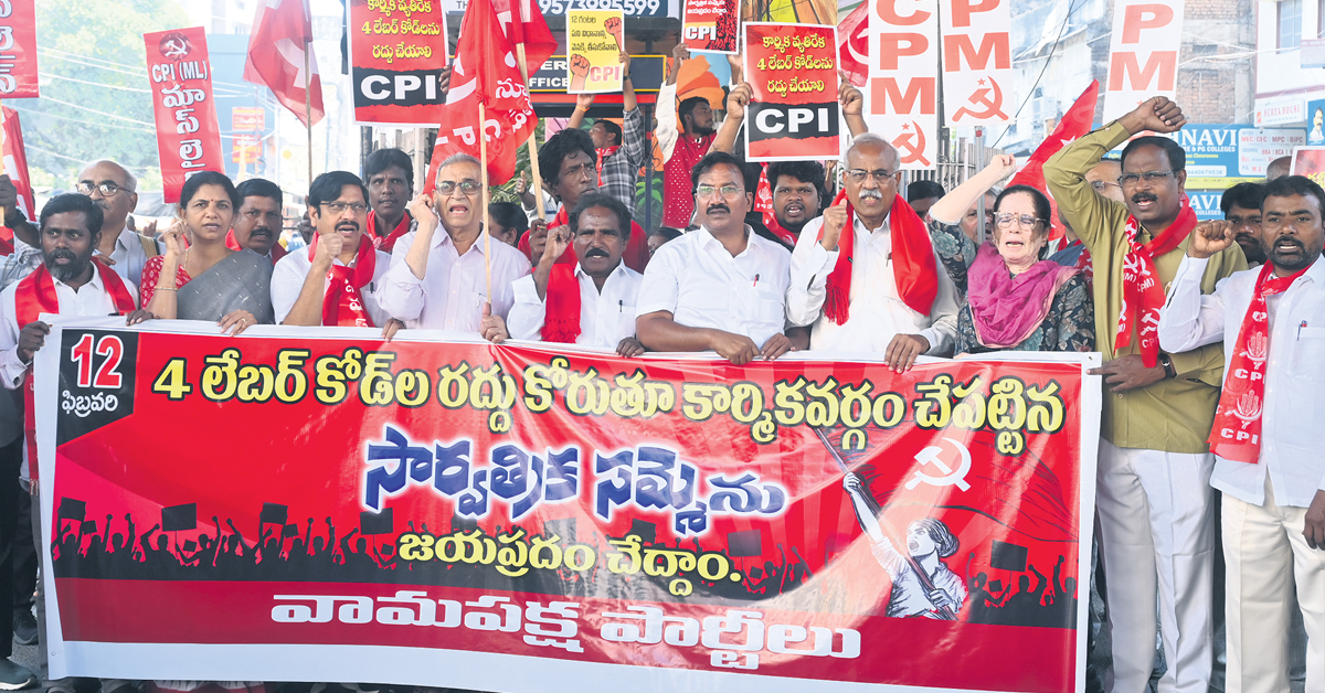 కేంద్ర ప్రభుత్వం ఇటీవల తీసుకొచ్చిన కార్మిక, రైతాంగ, ప్రజావ్యతిరేక చట్టాలను రద్దు చేసేంత వరకు రాజీలేని పోరాటాలు చేస్తామని వామపక్ష పార్టీల నేతలు ప్రకటించారు. ఈ పోరాటం ఆరంభం మాత్రమేననీ, మున్ముందు ఉధృతం చేస్తామనీ చెప్పారు. కార్మిక సంఘాలు తలపెట్టిన సార్వత్రిక సమ్మెకు మద్దతుగా సీపీఐ, సీపీఐ(ఎం), సీపీఐ(ఎంఎల్) న్యూడెమోక్రసీ, సీపీఐ(ఎంఎల్-మాస్లైన్), ఎస్యూసీఐ, ఏఐఎఫ్బీ, సీపీఐ(ఎంఎల్-లిబరేషన్) ఆధ్వర్యంలో గురువారం నారాయణగూడ చౌరస్తాలో నిరసన కార్యక్రమం చేపట్టారు. మోడీ ప్రభుత్వం అనుసరిస్తున్న ప్రజావ్యతిరేక విధానాలను నిరసిస్తూ నినాదాలు చేశారు. ఈ సందర్భంగా సీపీఐ జాతీయ కార్యదర్శి పల్లా వెంకటరెడ్డి, సీపీఐ(ఎం) రాష్ట్ర కార్యదర్శి జాన్వెస్లీ, సీపీఐ(ఎంఎల్-న్యూడెమోక్రసీ) అధికార ప్రతినిధి చలపతిరావు, సీపీఐ(ఎంఎల్-మాస్లైన్) గ్రేటర్ హైదరాబాద్ కార్యదర్శి హన్మేశ్, సీపీఐ(ఎంఎల్ -లిబరేషన్) రాష్ట్ర కార్యదర్శి మామిండ్ల రమేశ్ రాజా, ఎస్యూసీఐ రాష్ట్ర కార్యదర్శి మురహరి మాట్లాడారు.