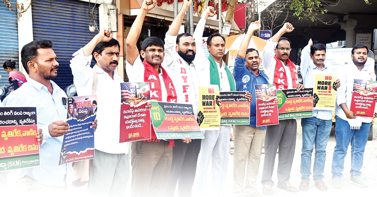 అమెరికా సామ్రాజ్యవాద దురాక్రమణకు వ్యతిరేకంగా పోరాడుదామని పలు ప్రజా సంఘాలు పిలుపునిచ్చాయి. ఇరాన్పై అమెరికా, ఇజ్రాయిల్ దాడులను ఖండిస్తూ మంగళవారం ప్రజా సంఘాల ఆధ్వర్యంలో నేతలు ఆర్టీసీ క్రాస్రోడ్లో నిరసన వ్యక్తం చేశారు. ఈ సందర్భంగా రైతు సంఘం రాష్ట్ర కార్యదర్శి టి.సాగర్, కేవీపీఎస్ రాష్ట్ర కార్యదర్శి స్కైలాబ్ బాబు, డీవైఎఫ్ఐ రాష్ట్ర అధ్యక్ష, కార్యదర్శులు కోటా రమేష్, అనగంటి వెంకటేష్, ఎస్ఎఫ్ఐ రాష్ట్ర అధ్యక్షులు ఎస్.రజినీకాంత్లు మాట్లాడుతూ ప్రపంచ దేశాలు తమ ఆధీనంలో ఉండాలని అమెరికా ఇతర దేశాలపై దాడులు చేస్తున్నదని విమర్శించారు. పెట్రేగిపోతున్న అమెరికా సామ్రాజ్యవాదం కారణంగా గాజా, పాలస్తీనాపై యుద్ధంతో పాటు రష్యా-ఉక్రెయిన్పై నాలుగు సంవత్సరాలుగా యుద్ధం జరుగుతున్నదని తెలిపారు. ఈ యుద్ధాల ప్రభావం భారతదేశంపై కూడా పడుతున్నదని చెప్పారు.