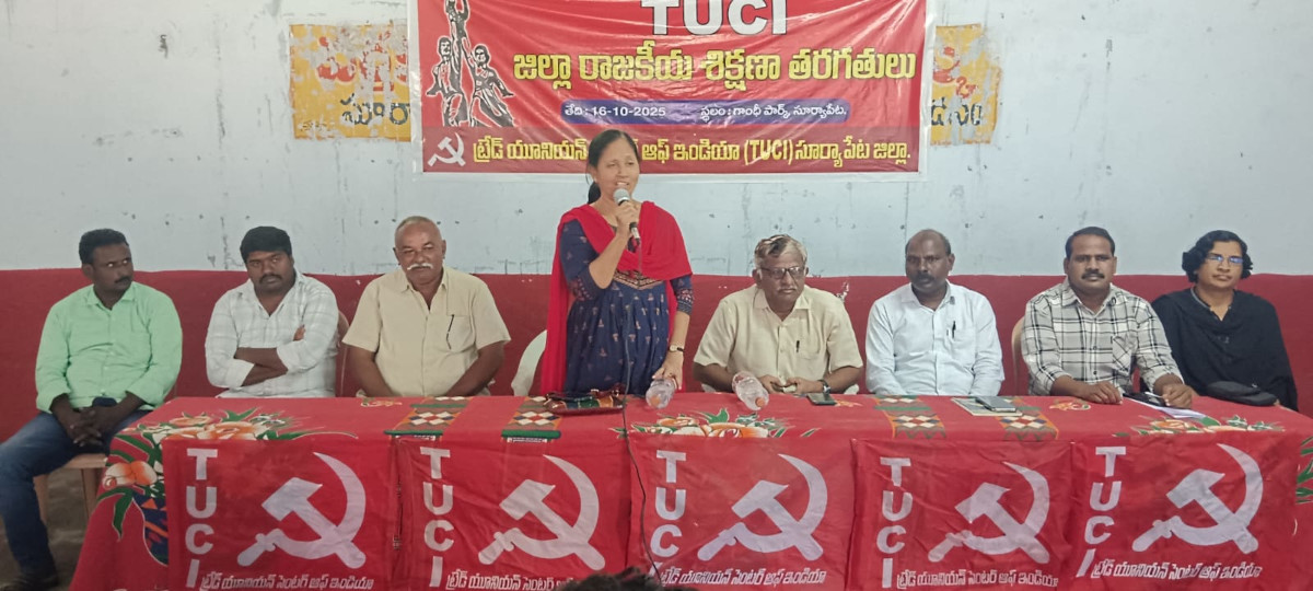 కార్మికుల హక్కుల కొరకు ప్రతి ఒక్కరు పోరాడాలని సీపీఐ(ఎం.ఎల్) మాస్ లైన్ పార్టీ జిల్లా కార్యదర్శి కొత్తపల్లి శివ కుమార్ కోరారు. గురువారం సూర్యాపేట జిల్లా కేంద్రంలోని గాంధీ పార్క్ లో టియుసిఐ జిల్లా కమిటీ ఆధ్వర్యంలో జిల్లా రాజకీయ శిక్షణా తరగతులు జిల్లా అధ్యక్షుడు గొడ్డలి నర్సయ్య అధ్యక్షతన నిర్వహించారు. ఈ సందర్భంగా ఆయన మాట్లాడుతూ మొదటి క్లాస్ మాట్లాడుతూ కార్మిక హక్కులను కాలరాస్తున్న ఈ దోపిడీ ప్రభుత్వాలపై తిరుగుబాటు జెండా ఎగరవేయకుండా సమస్యలు పరిష్కారము కావని అన్నారు.సంగటిత అసంఘటిత కార్మికులను ఐక్యం చేస్తూ భారత రాజ్యాంగం ప్రకారం ఉన్నటువంటి చట్టాలను అమలుపరచకుండా కేంద్ర,రాష్ట్ర ప్రభుత్వాలు వాటిని నిర్వీర్యం చేస్తూ, రద్దు చేయటం సమంజసం కాదని వాటిని సాధించుకోవడం కోసం పోరాటం చేయాలని అన్నారు.