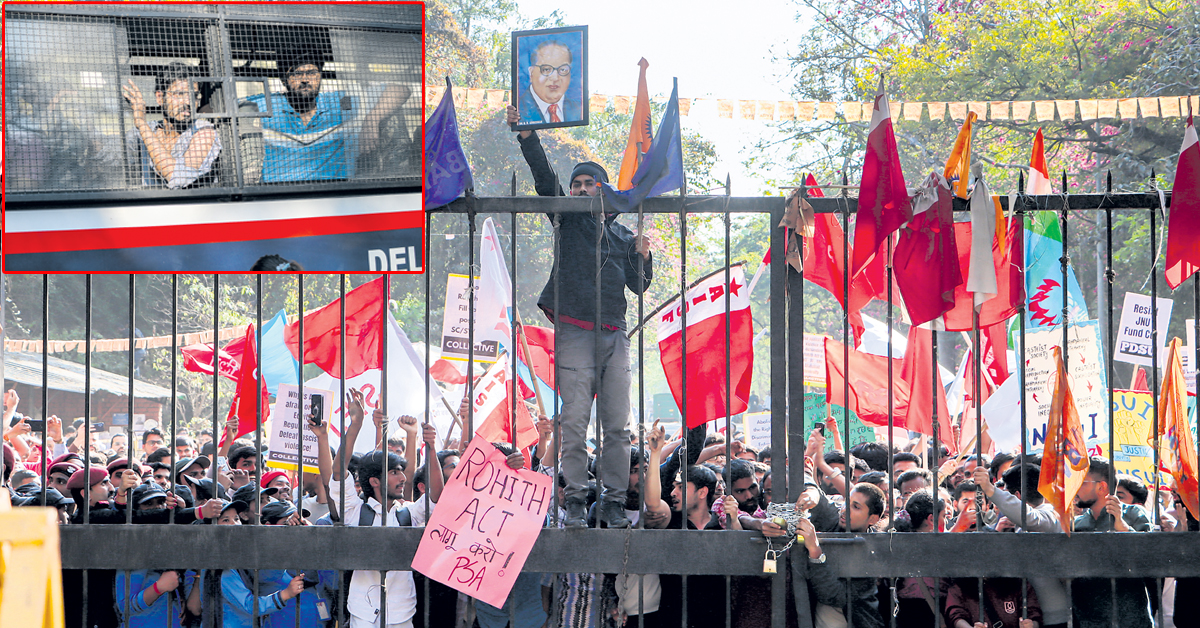 కుల వివక్ష నిర్మూలనకు యూజీసీ నిబంధనలు అమలు చేయాలనీ, రోహిత్ వేముల చట్టాన్ని అమలు చేయాలనీ, దళిత వ్యతిరేక వ్యాఖ్యలు చేసిన విసి శాంతిశ్రీ దిలీపూడి పండిట్ రాజీనామా చేయాలని డిమాండ్ చేస్తూ జేఎన్యూఎస్యూ ఆధ్వర్యంలో విద్యార్థులు గురువారం లాంగ్ మార్చ్ నిర్వహించారు. అదే విధంగా ప్రభుత్వ విద్యా సంస్థలకు నిధులు పెంచాలనీ, విశ్వవిద్యాలయ అధికారులకు వ్యతిరేకంగా నిరసన తెలిపిన జేఎన్యూ విద్యార్థి సంఘం ఆఫీస్ బేరర్లను బహిష్కరించే చర్యలను వెనక్కి తీసుకోవాలని కోరుతూ కేంద్ర విద్యా మంత్రిత్వ శాఖ కార్యాలయానికి వెళ్తున్న విద్యార్థులను ఢిల్లీ పోలీసులు అడ్డుకున్నారు. వారు లోపలికి వెళ్లకుండా ఢిల్లీ పోలీసులు, సీిఆర్పీఎఫ్, ఆర్ఎఎఫ్ దళాలు దాడికి పాల్పడ్డాయి. ఈ దాడుల్లో పదుల సంఖ్యలో విద్యార్థులు గాయపడ్డారు. జేఎన్యూఎస్యూ కార్యవర్గ సభ్యులతో సహా అనేక మందిని అరెస్టు చేసి పోలీస్స్టేషన్కు తరలించారు.