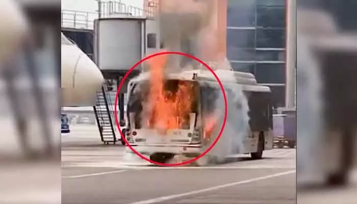 నవతెలంగాణ-హైదరాబాద్ : ఢిల్లీలోని ఇందిరా గాంధీ అంతర్జాతీయ విమానాశ్రయంలోని టెర్మినల్-3 వద్ద మంగళవారం మధ్యాహ్నం ఒంటిగంట ప్రాంతంలో భారీ అగ్ని ప్రమాదం చోటుచేసుకుంది. వివరాల్లోకి వెళితే.. ఎయిరిండియా SATS ఎయిర్పోర్ట్ సర్వీసెస్ ప్రయివేటు లిమిటెడ్కు చెందిన షటిల్ బస్సు బే నంబర్-32 సమీపంలో ఎయిరిండియా ఫ్లైట్ వద్ద పార్క్ చేశారు. అయితే, ఉన్నట్టుండి అదే బస్సులో భారీగా మంటలు ఎగసిపడ్డాయి. అయితే, ప్రమాద సమయంలో బస్సులో ప్రయాణికులెవరూ లేకపోవడంతో పెను ప్రమాదం తప్పింది. విమానానికి కొన్ని మీటర్ల దూరంలో ఉండగా.. బస్సులో మంటలు చెలరేగడం ఎయిర్పోర్టులో అధికారుల్లో దడ పెట్టింది. దీంతో వారు హుటాహుటిన ఫైర్ సిబ్బందికి సమాచారం అందజేయడంతో వారు స్పాట్కు చేరుకుని మంటలను అదుపు చేస్తున్నారు. బస్సులో షార్ట్ సర్క్యూట్ వల్లే మంటలు చెలరేగాయని ఎయిర్పోర్టు వర్గాలు, ఫైర్ సిబ్బంది భావిస్తున్నాయి.