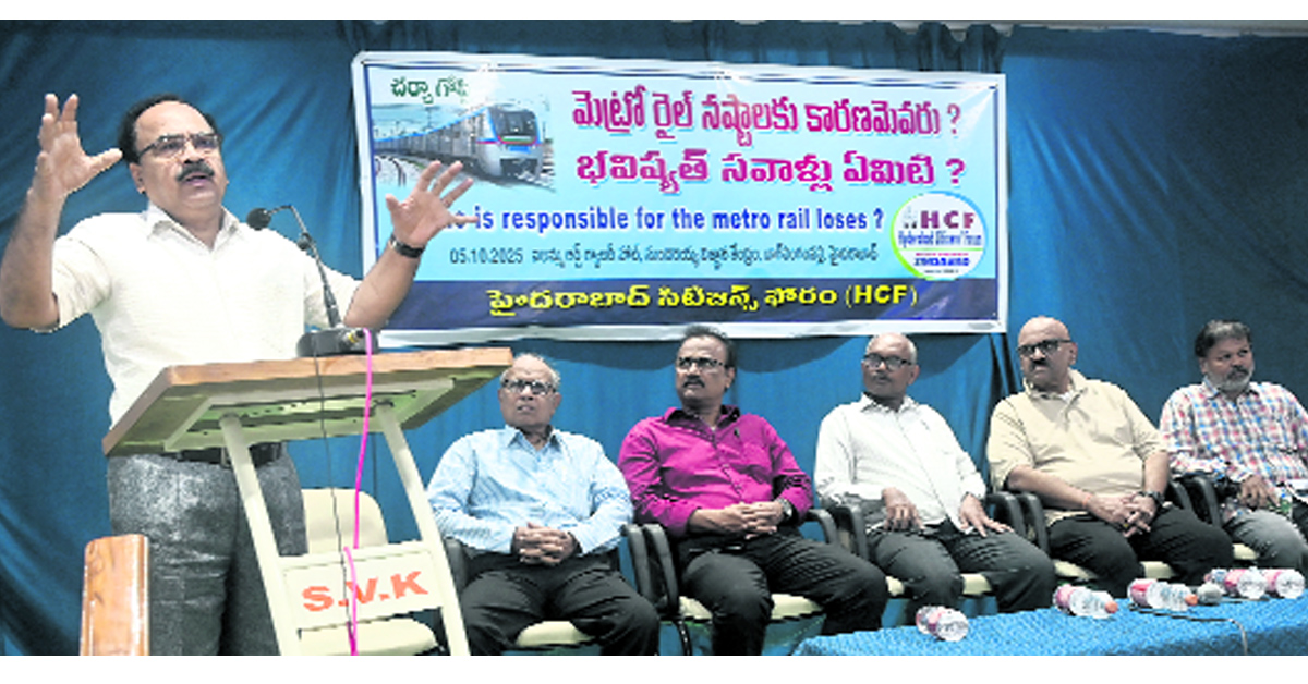 మెట్రో రైల్ ప్రాజెక్టు పేరుతో బస్ రవాణా, ఎంఎంటీఎస్, ఫుట్పాత్ల వ్యవస్థలను నిర్లక్ష్యం చేశారని ఆరోపించారు. గత బీఆర్ఎస్ ప్రభుత్వ హయాంలో 36 ఫ్లైఓవర్లు నిర్మించినా, ఒక్క ఫుట్ పాత్ కూడా నిర్మించలేదన్నారు. తెలంగాణ అర్బన్ డెవలప్మెంట్ ఫోరం కన్వీనర్ ఎం.శ్రీనివాస్ మాట్లాడుతూ.. నష్టాల పేరుతో మెట్రో రైల్ నిర్వహణ నుంచి ఎల్అండ్టీ తప్పుకోవడం ఒప్పంద ఉల్లంఘనే అవుతుందన్నారు. ఎల్అండ్టీ సంస్థ ఆర్థిక లక్ష్యాలు సాధించడంలో పూర్తిగా విఫలమైందనీ, నష్టాలకు పూర్తి బాధ్యత ఎల్అండ్టీ సంస్థనే వహించాలన్నారు. ఒప్పందానికి విరుద్ధంగా ఎల్అండ్టీ సంస్థ మెట్రో రైల్ ఛార్జీలు భారీగా పెంచి సామాన్య ప్రయాణికులపై భారం మోపి ప్రయాణికుల సౌకర్యాలపై ఏ మాత్రం శ్రద్ధ వహించలేదన్నారు. రైల్ కోచ్ల సంఖ్యను పెంచాలనే డిమాండ్ను కనీసం పట్టించుకోలేదన్నారు. మెట్రో రైల్ రెండో దశకు అనుమతి ఇవ్వడంలో కేంద్ర ప్రభుత్వం వివక్షత చూపిస్తుందనీ, కొర్రీలు వేయడం మానుకుని మెట్రో ప్రాజెక్టుకు కేంద్ర సహాయం అందించాలని విజ్ఞప్తి చేశారు. సామాజిక వేత రాజీవ్కుమార్, పర్యావరణవేత్త డాక్టర్ జయసూర్య ప్రసంగించారు. ఈ కార్యక్రమంలో హెచ్సీఎఫ్ ప్రధాన కార్యదర్శి కె.వీరయ్య, కోశాధికారి రాజమౌళి, నాయకులు పి.శ్రీనివాసరావు, మోహన్, సంగీత, కె.లలిత, హస్మిత, జె.నర్సింగరావు, కె.రమేష్, శంకర్ తదితరులు పాల్గొన్నారు.