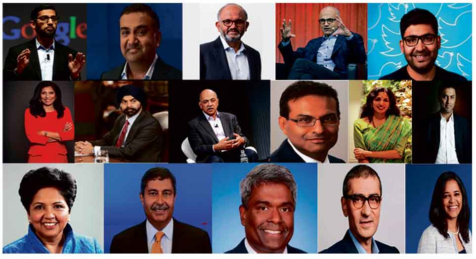 ప్రపంచంలోనే అగ్రస్థానాల్లో ఉన్న గూగుల్ సీఈఓ సుందర్ పిచారు, మైక్రోసాఫ్ట్ సీఈఓ సత్య నాదెళ్ళ, ఈ మధ్య వరకు ట్విట్టర్ సీఈఓగా కొనసాగిన అగర్వాల్, శంతను నారాయణ్-అడోబ్,అరవింద్ కష్ణ-ఐబీఎం, నికేశ్ అరోరాపాలొ ఆల్టో నెట్వర్క్స్,పెప్సికోలా ఒకప్పటి సీఈఓ ఇంద్రనూయి, అర్వింద్ కష్ణ- ఐబీఎమ్ గుంజన్ షా- బాటా, వసంత్ నరసింహన్- నోవార్టిస్, రేవతి అద్వైతి- ఫ్లెక్స్, పునీత్ రంజన్ – డెలాయిట్ వంటి వారెందరూ కూడా భారతీయ మూలలున్నవారే. నేడు ప్రపంచంలో వివిధ దేశాల్లో ప్రముఖపాత్ర వహిస్తున్న ప్రవాస భారతీయులు బ్రిటిష్ రాజ్ కాలంలో, తదనంతరం విదేశాలకు వెళ్ళినవారే. ముఖ్యంగా వ్యవసాయం పనుల కోసం వెళ్ళిన భారతీయులు అక్కడ స్థిరపడ్డారు. మారిషస్, గయానా, ట్రినిడాడ్ అండ్ టుబాగో, కెనడా, దక్షిణాఫ్రికా మలేసియా, ఫిజీ వంటి కామన్వెల్త్ దేశాల్లో ముఖ్య భూమిక పోషిస్తున్నవారు వీరే.