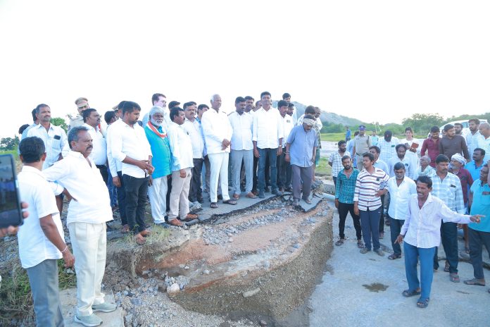 రైతులకు సమాచారం ఇవ్వకుండా రిజర్వాయర్ గేట్లు ఎత్తిన నీటిపారుదల శాఖ అధికారులపై ఆగ్రహం వ్యక్తం చేశారు. వరద ఉదృతుని అంచనా వేయడంలో వైఫల్యం అయ్యారని, ముందస్తు జాగ్రత్త చర్యలు ఎందుకు తీసుకోలేదని ప్రశ్నించారు.అధికారుల తీరు పట్ల అసహనం వ్యక్తం చేశారు. మళ్ళీ ఇలాంటి ఘటనలు పునరావృతం కాకుండా శాశ్వత పరిష్కారం ఆలోచించాలని తెలిపారు. వరద నీరు వెళ్లే కాలువను రెవెన్యూ అధికారులతో సర్వే చేయించి రైతుల సహకారంతో కాలువ వెడల్పు చేయాలని సూచించారు. వరద ఉదృతికి పూర్తిగా దెబ్బతిన్న కల్వర్టును వెంటనే మారమ్మత్తులు చేపట్టాలని, అందుకు సంబంధించిన ప్రతిపాదనలు సిద్ధం చేయాలని సూచించారు.ఈ కార్యక్రమంలో వ్యవసాయ, పంచాయతీ రాజ్, నీటిపారుదల, పశు సంవర్ధక శాఖ అధికారులతో పాటు తహసీల్దార్, ఎంపిడివో, ఇతర అధికారులు, మండల నాయకులు, కార్యకర్తలు, రైతులు, గ్రామస్తులు తదితరులు పాల్గొన్నారు.
