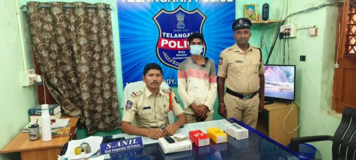 ఈ నేపథ్యంలో కేసు నమోదు చేసి దర్యాప్తు చేపట్టిన పోలీసులు గురువారం ఉదయం పోలీస్ స్టేషన్ ముందు వాహనాల తనిఖీలు నిర్వహిస్తున్న సమయంలో అనుమానాస్పదంగా ప్రవర్తించిన వ్యక్తిని గుర్తించారు. అంకిరెడ్డిపల్లి గ్రామానికి చెందిన అజ్మీర అశోకు అలియాస్ గణేష్ (29) బైక్‌పై వస్తూ పోలీసులను చూసి పారిపోవడానికి ప్రయత్నించగా, వెంటనే అతన్ని అదుపులోకి తీసుకున్నారు. విచారణలో అతడు నిన్న జరిగిన మొబైల్ షాప్ దొంగతనానికి పాల్పడినట్లు ఒప్పుకున్నాడు. షాప్ షట్టర్ తాళాలు పగలగొట్టి మూడు ఫోన్లు, నగదు దొంగిలించినట్లు తెలిపాడు.