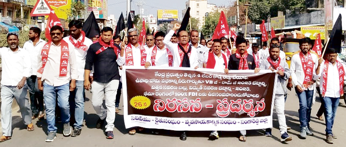 కార్మికులు, రైతులు, కూలీలపై మోడీ ప్రభుత్వం పగబట్టిందని.. వారి హక్కులను కాలరాసి కట్టు బానిసలుగా మార్చే కుట్ర చేస్తున్నదని సీఐటీయూ రాష్ట్ర అధ్యక్షులు చుక్క రాములు మండిపడ్డారు. రైతులకు నష్టం చేసేలా విత్తన చట్ట సవరణ చేసిందని ఆగ్రహం వ్యక్తం చేశారు. కేంద్ర ప్రభుత్వ కార్మిక, రైతు వ్యతిరేక విధానాలను నిరసిస్తూ సంగారెడ్డిలో సీఐటీయూ, రైతు సంఘం, వ్యవసాయ కార్మిక సంఘాల ఆధ్వర్యంలో సుందరయ్య భవన్ నుంచి ఐబీ వరకు నిరసన ర్యాలీ నిర్వహించారు. ఈ సందర్భంగా చుక్క రాములు మాట్లాడుతూ.. మహాత్మాగాందీ పేరుతో ఉన్న ఉపాధి హామీ చట్టాన్ని రద్దు చేసి, వీబీ రాంజీ పేరుతో ఆ చట్టాన్ని బలహీనం చేశారని, ఇది చాల దారుణమైన విషయమని అన్నారు. కొత్తం చట్టంతో 40శాతం రాష్ట్రం, 60శాతం కేంద్రం పరిధిలోకి తెచ్చిందన్నారు. దీంతో రాష్ట్రాలపై మరింత భారం పడి.. కార్మికులకు నష్టం జరుగుతుందన్నారు. నూతనంగా అమల్లోకి తెచ్చిన లేబర్ కోడ్లతో.. కార్మికులు తిరగి బానిసలుగా మారే ప్రమాదమున్నదన్నారు. కనీసం సంఘాలు కూడా పెట్టుకునే అవకాశం లేకుండా చేశారన్నారు.