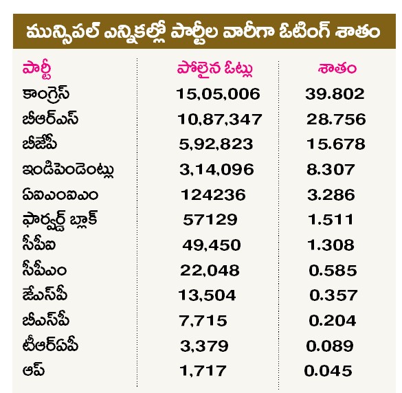 రాష్ట్ర వ్యాప్తంగా 7 మున్సిపల్ కార్పొరేషన్లు, 116 మున్సిపాల్టీల్లోని 2,983 వార్డులకు జరిగిన ఎన్నికల్లో మొత్తం 52,17,413 మంది ఓట్లకు గాను 38,09,406 ఓట్లు పోలయ్యాయి. ఇందులో 50 శాతానికి పైగా వార్డుల్లో కాంగ్రెస్ ఆధిక్యత కనబర్చింది. పర్సంటేజీ పరంగానూ ఆ పార్టీ ముందు వరసలో నిలిచింది. మున్సిపాల్టీలు, మున్సిపల్ కార్పొరేషన్ల ఎన్నికల్లో ఏ పార్టీకి ఎంత శాతం ఓట్లు నమోదయ్యాయో ఎన్నికల అధికారులు శనివారం వెల్లడించారు.