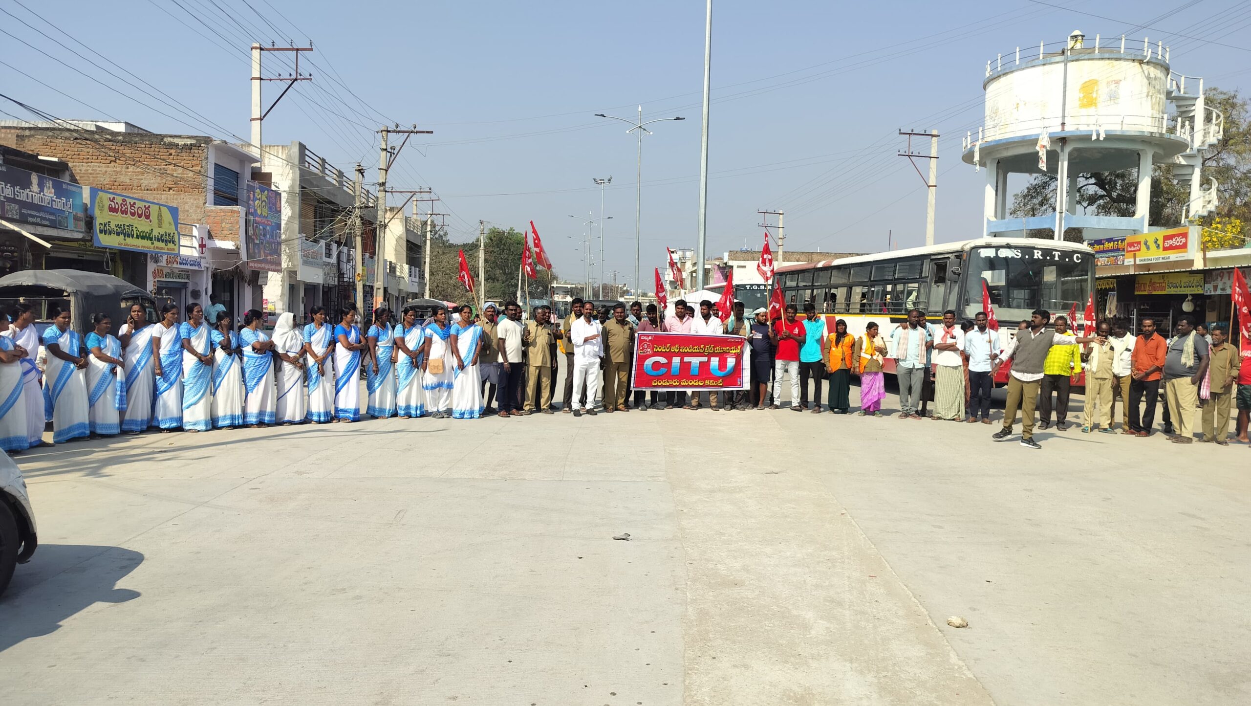 కేంద్రంలోని మోడీ ప్రభుత్వం అనుసరిస్తున్న రైతాంగ, కార్మిక ప్రజా వ్యతిరేక విధానాలపై కార్మిక వర్గం పోరాటాలకు సిద్ధం కావాలని సీపీఐయూ జిల్లా నాయకులు జెర్రిపోతుల ధనంజయ అన్నారు. గురువారం చండూరు మండల కేంద్రంలో కార్మికుల హక్కుల పరిరక్షణ ధ్యేయంగా దేశవ్యాప్తంగా కార్మిక సంఘాలు ఇచ్చిన పిలుపుమేరకు సీపీఐయూ చండూరు మండల కమిటీ ఆధ్వర్యంలో రాస్తారోకో నిర్వహించారు ఈ సందర్భంగా ఆయన మాట్లాడుతూ, నరేంద్ర మోడీ ప్రభుత్వం మూడోసారి అధికారంలోకి వచ్చిన తరువాత ప్రజా వ్యతిరేక విధానాలు వేగంగా అమలు చేస్తున్నారని ఆయన అన్నారు. ప్రధానంగా కేంద్రం తెచ్చిన నూతన కార్మిక చట్టాలను రద్దు చేయాలని, పాత చట్టాలను పునరుద్ధరణ చేయాలని, కార్మికులకు నష్టం కలిగించే నాలుగు లేబర్ కోడ్ లను రద్దు చేయాలనిఆయన కేంద్ర ప్రభుత్వాన్ని డిమాండ్ చేశారు. ఆశ, గ్రామపంచాయతీ, మున్సిపల్ కార్మికులకు కనీస వేతనం 26,000 ఇవ్వాలని ఆయన అన్నారు.