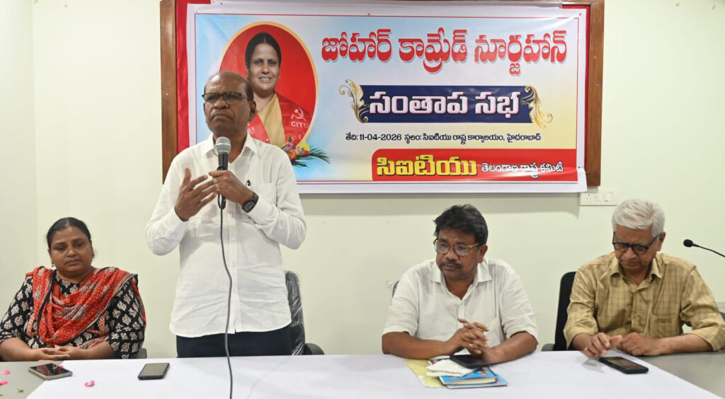 నవతెలంగాణ – హైదరాబాద్: సీఐటీయూ నిజామాబాద్ జిల్లా కార్యదర్శి కామ్రేడ్ నూర్జహాన్ (43) అనారోగ్యంతో నిజామాబాద్ పట్టణంలోని వెల్నెస్ హాస్పిటల్లో శుక్రవారం సాయంత్రం 4-20 ని.లకు ఊపిరితిత్తుల సమస్య, గుండెపోటుతో మృతి చెందారు. నూర్జహాన్ మరణం కార్మిక, ప్రజాతంత్ర ఉద్యమానికి తీరని లోటు. నూర్జహాన్ మృతి పట్ల సీఐటీయూ రాష్ట్ర కమిటీ తీవ్ర సంతాపాన్ని తెలియజేస్తూ శ్రద్ధాంజలి ఘటిస్తున్నది. వారి కుటుంబానికి ప్రగాఢ సానుభూతిని తెలియజేస్తున్నది.
