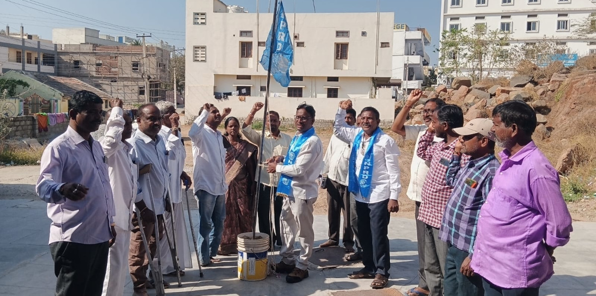 రాష్ట్ర ప్రభుత్వం వికలాంగులకు ఇచ్చిన హామీల అమలు కోసం,స్థానిక సంస్థల్లో, నామినేటెడ్ పదవుల్లో రిజర్వేషన్స్ సాధన కోసం పోరాటలు ఉదృతం చేస్తామని,ఆత్మగౌరవం, హక్కుల సాధన కోసంఉద్యమించాలని వక్తలు పిలుపునిచ్చారు. శనివారం  సంఘం  కార్యాలయం వద్ద ఎన్ పి ఆర్ డి 16వ ఆవిర్భావ దినోత్సవంసందర్బంగా జెండా ఆవిష్కరణ రాష్ట్ర అధ్యక్షులు కె వెంకట్ చేశారు. ఈ సందర్బంగా ఎన్.పి.ఆర్.డి రాష్ట్ర అధ్యక్ష లు కె వెంకట్  మాట్లాడుతూ జాలి, దయ, కరుణ మాకొద్దు, మా హక్కులు మాకు కావాలి అంటూ దేశ వ్యాప్తంగా వికలాంగులను ఐక్యం చేయడానికి 2010ఫిబ్రవరి 21-22 తేదీల్లో ఎన్ పి ఆర్ డి  కలకత్తా పట్టణంలో ఏర్పడిందని,ఆత్మగౌరవం, హక్కుల సాధన కోసం వికలాంగులను సమీకరించి పోరాటాలు చేస్తుందని అన్నారు.