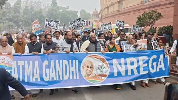 నవతెలంగాణ-హైదరాబాద్: పార్లమెంట్ ఆవరణలో విపక్షాలు ఆందోళన బాటపట్టాయి.బుధవారం మహాత్మాగాంధీ జాతీయ గ్రామీణ ఉపాధి హామీ చట్టాన్ని విబి-జి రామ్ జిగా కేంద్రం పేరు మారుస్తూ లోక్సభలో బిల్లు ప్రవేశపెట్టి… ప్రతిపక్షాల ఆందోళనల మధ్యే మెజార్టీతో ఆమోదింపజేసుకుంది. కేంద్రం తీసుకున్న ఈ చర్యను వ్యతిరేకిస్తూగురువారం ప్రతిపక్ష ఎంపీలు పార్లమెంటు ఆవరణలోనే ఎంజిఎన్ఆర్ఇజిఎ రాసిన బ్యానర్ను, గాంధీజీ చిత్రపటాలను చేతబట్టి నిరసన చేపట్టారు. మహాత్మాగాంధీని అవమానపరచడాన్ని సహించమని నినాదాలు చేశారు. మోడీ ప్రభుత్వం పెరిగిపోతున్న మైనార్టీలపై దాడుల్ని కూడా ఖండిస్తున్నట్లు ప్రతిపక్ష ఎంపీలు నినాదాలతో హోరెత్తించారు.