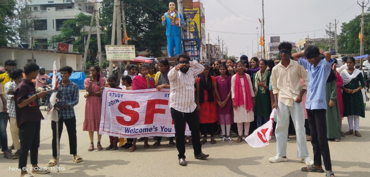 కళ్లకు గంతలు కట్టుకొని ఎస్ఎఫ్ఐ ఆధ్వర్యంలో నిరసన