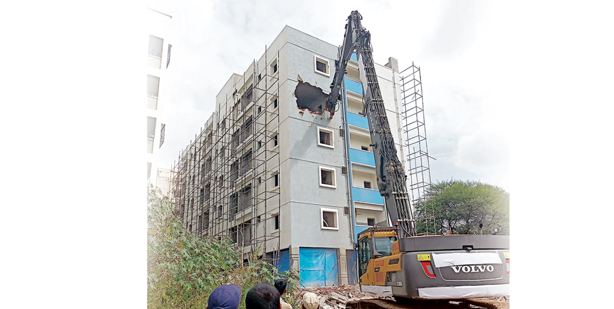 రంగారెడ్డి జిల్లా మియాపూర్లో కోట్లాది రూపాయల విలువచేసే ఐదంతస్తుల అపార్ట్ మెంట్ను శనివారం హైడ్రా కూల్చివేసింది. అక్రమ నిర్మాణాల విషయంలో దూకుడుగా వెళ్తోన్న హైడ్రా ప్రజావాణిలో ఫిర్యాదు వచ్చిన వెంటనే రంగంలోకి దిగి దర్యాప్తు చేసింది. హైడ్రా పరిశీలనలో సదరు భవనం, నిర్మాణ స్థలం అక్రమమని తేలింది. ఎలాంటి అవాంఛనీయ ఘటనలూ జరగకుండా ముందు జాగ్రత్తగా భారీ సంఖ్యలో పోలీసులను మోహరించి పని పూర్తి చేశారు. హైడ్రా కమిషనర్ ఏవీ రంగనాథ్ తెలిపిన వివరాల మేరకు.. సంగారెడ్డి జిల్లా అమీన్పూర్లోని సర్వే నెంబర్ 337, 338 పక్కనే ఉన్న మియాపూర్ 101 సర్వే నెంబర్లోని ప్రభుత్వ భూమిని కొందరు కబ్జాచేశారు. అమీన్పూర్లోని సర్వే నంబర్ 337, 338లలో హుడా అప్రూవ్డ్ లేఅవుట్లో (400 గజాలలో 126 నెంబర్) ప్లాట్ కొనుగోలు చేసిన భాను కన్స్ట్రక్షన్స్ యజమానులు ఆ పక్కనే మియాపూర్లోని సర్వే నంబర్ 101 ప్రభుత్వ స్థలంలోకి చొరబడి ప్లాట్లు సృష్టించారు. హెచ్ఎండీఏ భూమిలోని దాదాపు 473 గజాలు కలుపుకొని భాను కన్స్ట్రక్షన్స్ యజమానులు ఎల్లారెడ్డి అండ్ అదర్స్ మొత్తం దాదాపు 873 గజాల మేర 5 అంతస్తుల భవనం నిర్మించారు. తప్పడు ఎల్ఆర్ఎస్ను సృష్టించిన భాను కన్స్ట్రక్షన్స్ యజమానులు డీడీలను సైతం ఫేక్వి తయారు చేశారు. ఇప్పటికే వారిపై అమీన్పూర్ పోలీస్స్టేషన్లో అధికారులు కేసు నమోదు చేశారు. ప్రభుత్వ భూమిలోకి చొరబడి చేపట్టిన నిర్మాణం కావడంతో స్థానిక రెవెన్యూ, హెచ్ఎండీఏ, మున్సిపాలిటీ అధికారులతో కలసి క్షేత్రస్థాయిలో హైడ్రా కమిషనర్ పరిశీలించారు. అన్ని డాక్యుమెంట్లను పరిశీలించిన తర్వాత ఐదంతస్తుల భవనాన్ని హైడ్రా నేలమట్టం చేసింది.