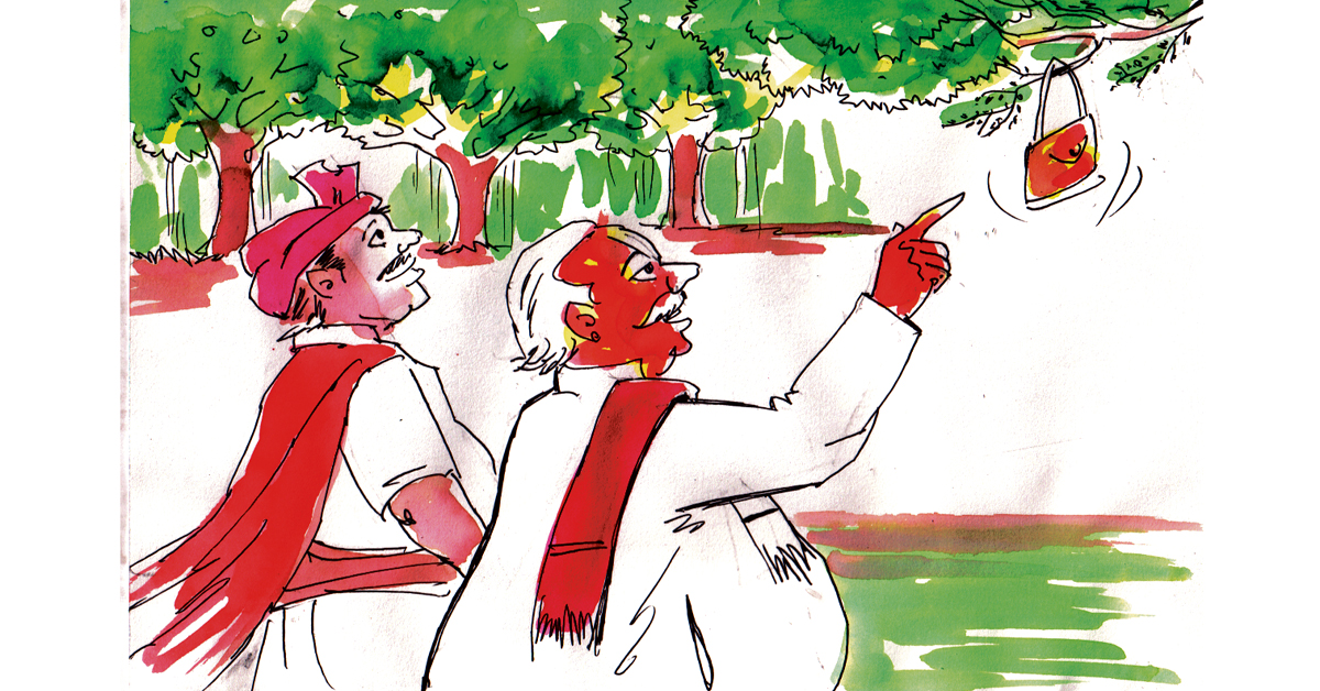 అతడు ఆ అడవిని సమీపించగానే అకస్మాత్తుగా వెనుకనుండి ఒక కోతి వచ్చి అతని సంచిని లాక్కొని మెరుపులా మాయమైంది.శరభయ్య దాని వెంబడి పరిగెత్తినా లాభం లేకపోయింది. తన అజాగ్రత్తకు తనను తానే తిట్టుకున్నాడు శరభయ్య. ఆ సంచిలో చాలా డబ్బు ఉంది. ”అయ్యో! ఇప్పుడు నా సంచి ఎలా దొరుకుతుంది? డబ్బు లేకుండా నేను పొరుగూరు వెళ్లి ఏం ప్రయోజనం? అది లేకుండా నా పని పూర్తి కాదే! ఇప్పుడు నేను ఏం చేయాలి?” అని ఏడవసాగాడు.