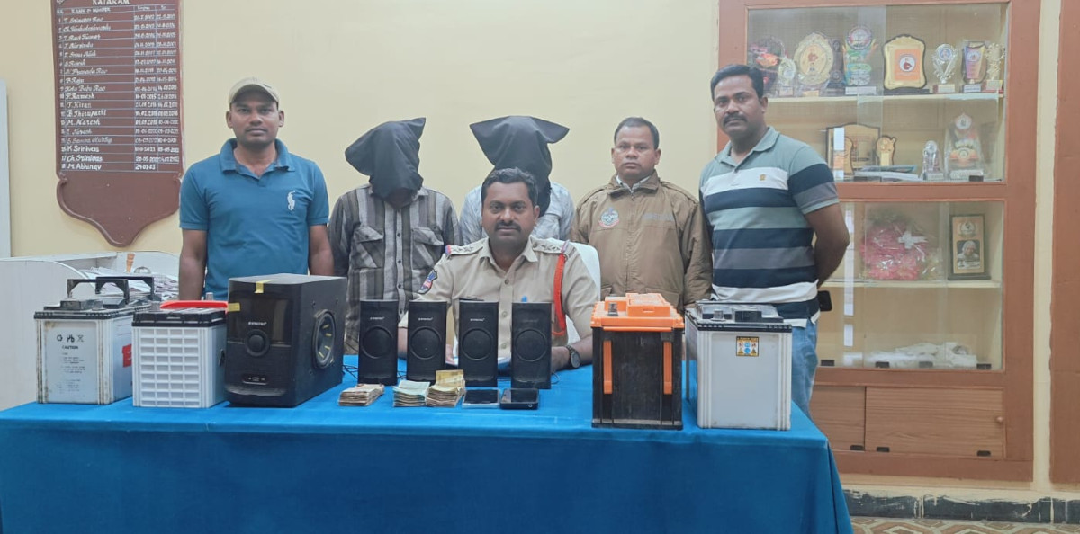 కాటారం మండలంలోని దొంగతనాలకు పాల్పడుతున్న ఇద్దరు వ్యక్తులను శనివారం పోలీసులు పట్టుకున్నారు. ఎస్సై శ్రీనివాస్ తెలిపిన వివరాల ప్రకారం.. దేవరంపల్లి గ్రామంలోని అనంతుల రాజసమయ్య కిరాణా షాపులో దొంగతనం చేసిన గోపాల్పూర్ గ్రామానికి చెందిన ఆకుదారి శ్రీకాంత్, దుర్గం బద్రీనాథ్ లను అరెస్టు చేశామని తెలిపారు. అదేవిధంగా వారి నుంచి రూ.8300 నగదును, రెండు మొబైల్ ఫోన్లను, నాలుగు ట్రాక్టర్ బ్యాటరీలను, ఒక హోమ్ థియేటర్ లను స్వాధీనం చేసుకున్నామని వెల్లడించారు. అనంతరం రిమాండ్ తరలించినట్లు ఎస్ ఐ శ్రీనివాస్ తెలిపారు.