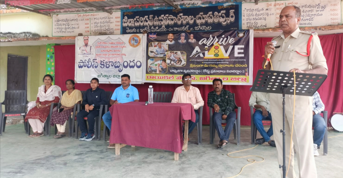 జిల్లా ఎస్పీ అశోక్ కుమార్ ఆదేశాల మేరకు.. జగిత్యాల డీఎస్పీ రఘు చందర్ సూచనలతో మండలంలోని భూపతిపూర్ జిల్లా పరిషత్ ఉన్నత పాఠశాలలో ఎస్సై సుధీర్ రావు ఆధ్వర్యంలో పోలీస్ కళా బృందం‘అరైవ్–అలైవ్’ కార్యక్రమంలో భాగంగా పలు సామాజిక అంశాలపై అవగాహన కల్పించారు.