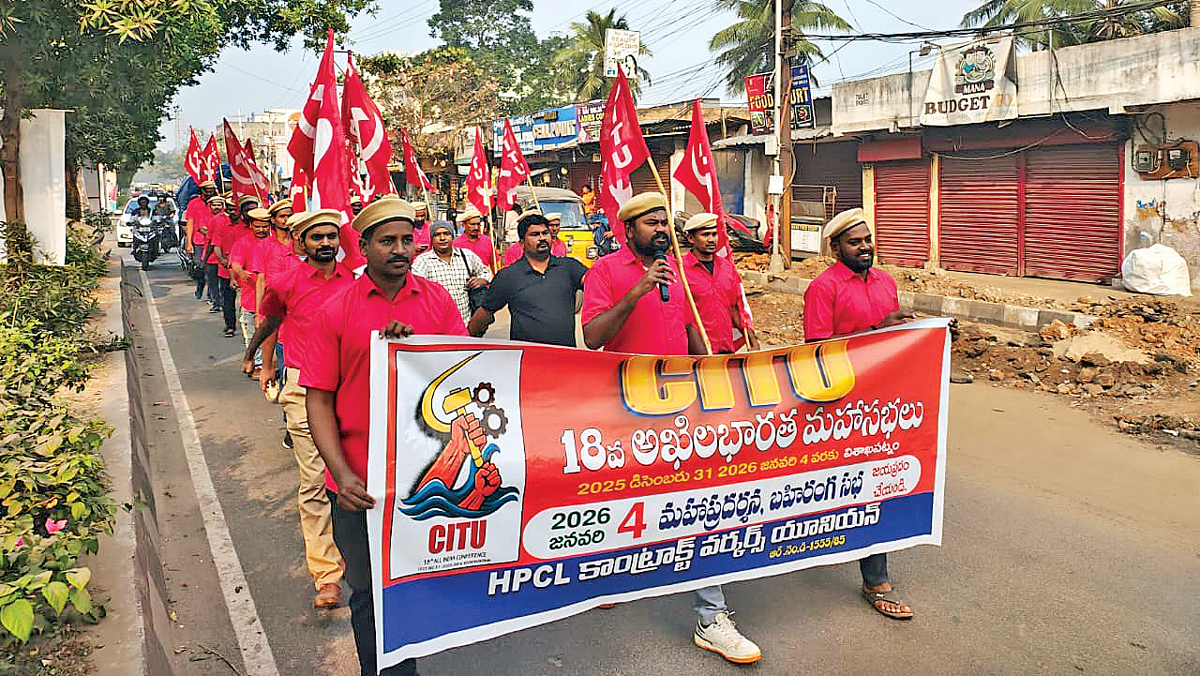 విశాఖ : విశాఖలో జరగనున్న సీఐటీయూ అఖిల భారత మహాసభను జయప్రదం చేయాలని కోరుతూ విశాఖపట్నం జిల్లా పాత గాజువాకలో ఆదివారం రెడ్ షర్ట్ వాలంటీర్లు కవాతు నిర్వహించారు. సీఐటీయూ సీనియర్ నాయకులు ఎన్.రామారావు జెండా ఊపి ప్రారంభించారు. పాత గాజువాక జంక్షన్ నుంచి కొత్తగాజువాక వరకు తిరిగి పాత గాజువాక వరకు రెడ్ షర్టులు, టోపీ ధరించి, సీఐటీయూ జెండా పట్టుకుని కవాతు నిర్వహించారు. మోడీ ప్రభుత్వం తీసుకొచ్చిన లేబర్ కోడ్లు రద్దు చేయాలని, కార్మికుల హక్కులు కాపాడాలని, మెడికల్ కాలేజీలు ప్రయివేటీకరణ రద్దు చేయాలని, డౌన్ డౌన్ క్యాపిటలిజం, అప్ అప్ సోషలిజం అనే నినాదాలతో కవాతు సాగింది. అనంతరం పాత గాజువాక జంక్షన్లో జరిగిన కార్యక్రమంలో స్టీల్ప్లాంట్ ఎంప్లాయీస్ యూనియన్ (సీఐటీయూ) ప్రధాన కార్యదర్శి జె.అయోధ్యరామ్ మాట్లాడుతూ, పాలకులు తీసుకున్న తప్పుడు నిర్ణయాల వల్ల విశాఖ స్టీల్ ప్లాంట్ నష్టాల్లో ఉందన్నారు. విశాఖ స్టీల్ప్లాంట్ వల్ల గాజువాక అభివృద్ధి చెందిందని తెలిపారు. సీఐటీయూ ఏపీ నాయకులు ఎం.రాంబాబు మాట్లాడుతూ, జనవరి 4వ తేదీన జరుగు బహిరంగసభకు ప్రజలు అధిక సంఖ్యలో తరలి రావాలని పిలుపునిచ్చారు.