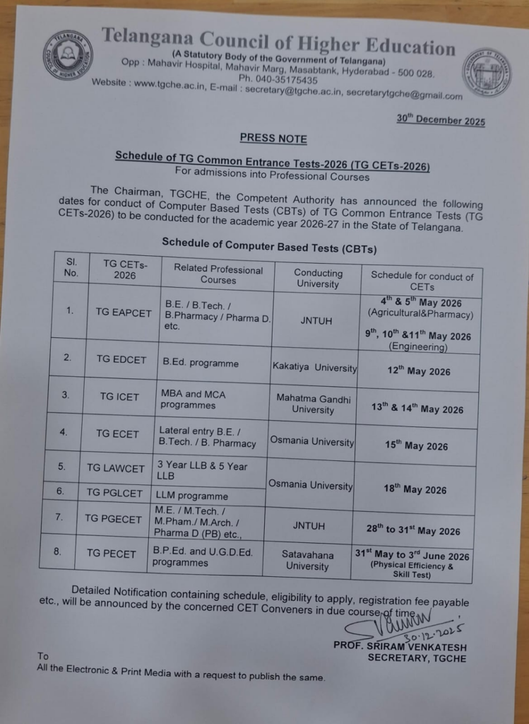 బీఈ, బీటెక్, బీ ఫార్మ‌సీ, ఫార్మ డీ త‌దిత‌ర కోర్సుల్లో ప్ర‌వేశానికి నిర్వ‌హించే TG EAPCET వ‌చ్చే ఏడాది మే 4నుంచి11 వ‌ర‌కు జ‌ర‌గ‌నున్నాయి. మే 4,5 ఫార్మా, అగ్రీకల్చ‌ర్ సంబంధించిన ప‌రీక్ష‌ల‌ను, మే 9,10,11న ఇంజ‌నీరింగ్‌కు సంబంధించిన ఎంట్ర‌న్స్ ఎగ్జామ్ జ‌ర‌గ‌నుంది. జూన్ 3న నిర్వ‌హించే TG PECETతో ఎంట్ర‌న్స్ ఎగ్జామ్స్ ముగియ‌నున్నాయి.