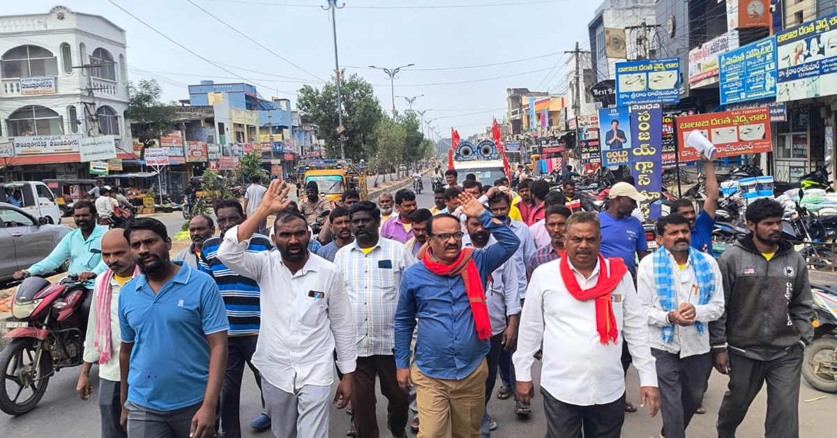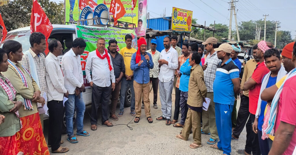 ఈ సందర్భంగా ఆయన మాట్లాడుతూ…..మోడీ 11 ఏళ్ల పాలన లో కార్మికులకు కర్షకులకు వ్యవసాయ కూలీలకు నష్టం చేసే చర్యలు చేపడుతున్నాడని ఆయన వివరించారు. కార్మికులు ఏళ్ల తరబడి పోరాడి సాధించుకున్న 29 చట్టాలను నాలుగు కోడ్లు గా మార్చి యజమానులకు కార్మికులను బానిసలు చేస్తూ పెట్టుబడిదారులకు దేశ సంపదను దోషీ పెడుతున్నాడని ఆయన మండిపడ్డారు.