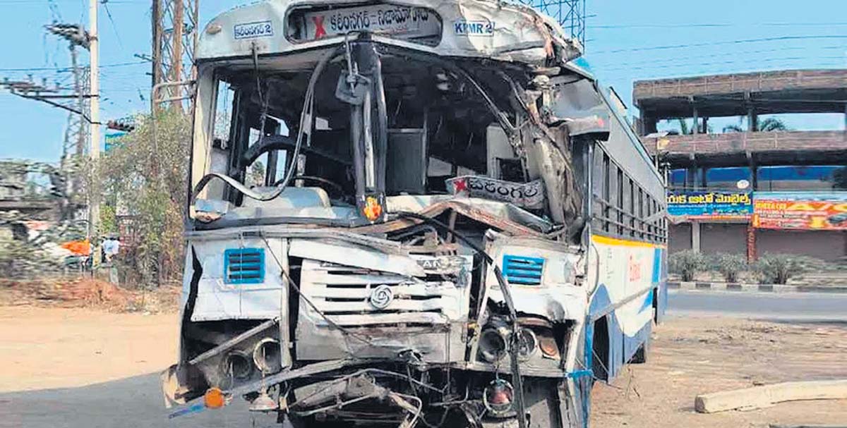 ఆర్టీసీ కార్మికులు అర్ధరాత్రి నుంచి సమ్మెకు పిలుపునివ్వడంతో ప్రజా రవాణా వ్యవస్థ స్తంభించిపోయింది. అయితే, ఎలాగైనా బస్సులు నడిపి తీరాలన్న పట్టుదలతో అధికారులు హడావిడిగా ప్రయివేటు డ్రైవర్లను రంగంలోకి దించారు. కరీంనగర్-2 డిపోకు చెందిన బస్సులో ప్రయాణికులను ఎక్కించి వరంగల్ పంపే క్రమంలో నగర శివారులోని అల్గూనూర్ సమీపంలో ప్రమాదానికి గురైంది. అద్దె డ్రైవర్కు వాహనంపై నియంత్రణ లేకపోవడంతో ఎదురుగా వస్తున్న లారీని బస్సు బలంగా ఢీకొట్టింది.