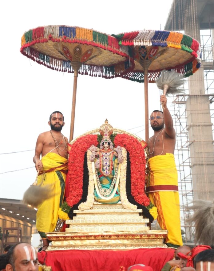నవతెలంగాణ యాదాద్రి జిల్లా ప్రతినిధి: తెలంగాణ రాష్ట్రంలోని ప్రముఖ వైష్ణవ పుణ్యక్షేత్రమైన యాదాద్రి తిరుమల స్వర్ణగిరి దేవస్థానంలో ఆదివారం రోజు సప్త వాహనాలపై శ్రీదేవి భూదేవి సమేతంగా ఊరేగిన శ్రీనివాసుడు. స్వర్ణగిరి దేవస్థానంలో రథ సప్తమి వేడుకలలో భాగంగా నేటి ఉదయం సుప్రభాత సేవ మొదలుకొని సప్త వాహనాలు సూర్య ప్రభా వాహనం , చిన్న శేష వాహనం , గజవాహనం , హనుమంత వాహనం , కల్పవృక్ష వాహనం , చంద్ర ప్రభావాహనం , గరుడ వాహనాలపై శ్రీదేవి భూదేవి సమేతంగా స్వర్ణగిరి శ్రీనివాసుడు ఆలయ పురవీధులలో వందలాది మంది భక్తుల గోవిందా నామాలను పటిస్తూ స్వామివారి పల్లకి సేవను మోసేందుకు అత్యంత ఉత్సాహాన్ని కనబరిచారు.