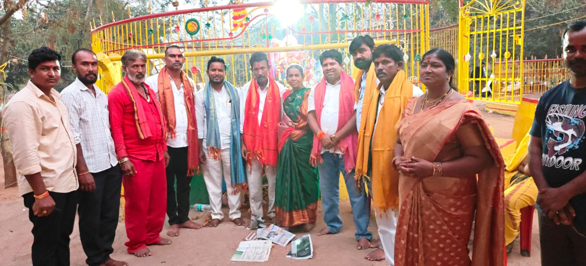 నల్గొండ జిల్లా నాగార్జున సాగర్ నియోజకవర్గం పెద్దవూర మండలం పొట్టిచేలిమ కృష్ణా నది తీరం లో చిన మేడారం గా పేరుపొందిన సమ్మక్క,సారక్క జాతరలో జాతర పరిధిలో వున్న కుంకుడుచెట్టు తండా,పొట్టేవాణితండా,నీమానాయక్ తండా పుల్యా తండా గ్రామాల సర్పంచులు రమావత్ హేమ్లానాయక్,రమావత్ బాబునాయక్,రమావత్ బాసునాయక్,రమావత్ లక్ష్మణ్ నాయక్ లు శనివారం సమ్మక్క,సారక్క ఆలయం లో పూజలు నిర్వహించి నిలువెత్తు బంగారం సమర్పించారు. ఈ సందర్బంగా ఆలయ గుంజా అంజమ్మ,కార్యదర్శి నాగపురి లక్ష్మి, ఆర్గనైజర్ కృష్ణంరాజు, జాతర ముఖ్య నిర్వహకులు నాగపురి వెంకట పతిరాజు, సాంభశివ, ప్రియదర్శినిలు సర్పంచులకు శాలువా కప్పి ఘన సన్మానం చేశారు.