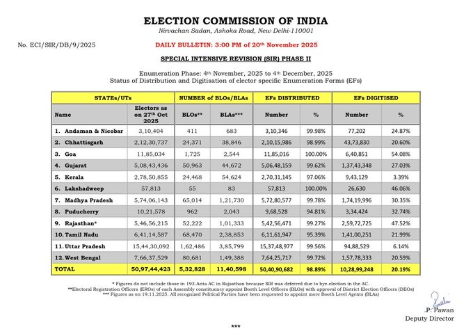 SIR రెండో విడతలో భాగంగా ఉత్తరప్రదేశ్లో అత్యధికంగా 15.37 కోట్ల ఫారాలు పంపిణీ చేశామని ఈసీ పేర్కొంది. మొత్తం ఓటర్లలో, 10,28 కంటే ఎక్కువ గణన ఫారాలు ఈ SIR రెండవ దశలో డిజిటలైజ్ చేయబడ్డాయని తాజాగా ప్రెస్ నోట్ పేర్కొంది.