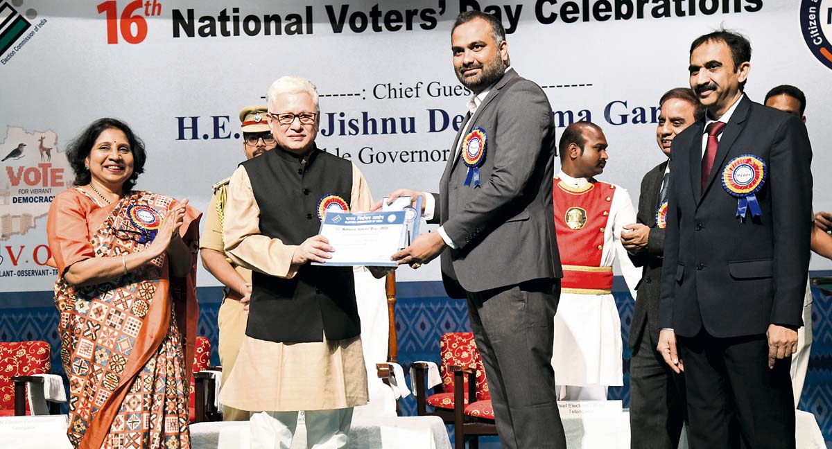 రాష్ట్రంలోని పలువురు కలెక్టర్లకు 16వ జాతీయ ఓటర్డే సందర్భంగా ప్రభుత్వం ఆవార్డులను ప్రకటించింది. ఆదివారం హైదారాబాద్లోని రవీంద్రభారతిలో జరిగిన కార్యక్రమంలో రాష్ట్ర గవర్నర్ జిష్ణుదేవ్ వర్మ అవార్డులను అందజేశారు. కరీంనగర్ కలెక్టర్ పమేలా సత్పతికి ఎన్నికల నిర్వహణ, రవాణా, జనగాం కలెక్టర్ రిజ్వాన్ భాషా షేక్కు శిక్షణ, వరంగల్ కలెక్టర్ సత్యశారదకు ఓటర్ల అవగాహనకు గాను ఉత్తమ అవార్డులను అందుకున్నారు. సిద్దిపేట కలెక్టర్ కె.హైమావతి, యాదాద్రి భువనగిరి కలెక్టర్ ఎం.హన్మంతరావు, రాజన్న సిరిసిల్ల కలెక్టర్ గరిమా అగర్వాల్, నిజామాద్ కలెక్టర్ ఇలా త్రిపాఠికి బెస్ట్ ఎలక్ట్రోల్ ప్రాక్టీస్ అవార్డులు అందుకున్నారు. జూబ్లీహిల్స్ ఎన్నికలను పకడ్బందిగా నిర్వహించిన జీహెచ్ఎంసీ కమిషనర్ ఆర్వీ.కర్ణన్కు ప్రత్యేక అవార్డును అందజేశారు. ఎస్వోలు, డీపీవోలు, డిప్యూటీ తహసిల్దార్లు, బీఎల్వో తదితర కేడర్లకు చెందిన మరో 35 మంది ఓటర్డే అవార్డులు అందుకున్నారు.