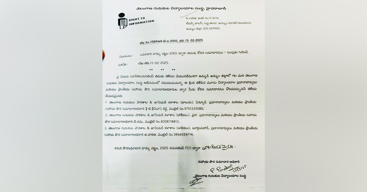 దానికి ఓ నెలరోజుల తర్వాత సరిగ్గా మార్చి 15వ తేదీన అధికారులు జవాబు ఇచ్చారు. ఉమ్మడి ఖమ్మం జిల్లాలోని మూడు తెలంగాణ గురుకుల పాఠశాలలు, కళాశాలలు ఏన్కూరు, వైరా, భద్రాద్రి కొత్తగూడెం జిల్లా బూర్గంపాడు ప్రధానా చార్యుల (ప్రాంతీయ సహాయ సమాచార అధికారులు) పేర్లు, వారి ఫోన్ నంబర్లు ఇచ్చి.. వారి ద్వారా సమాచారం పొందొచ్చని దరఖాస్తుదారుకు ప్రత్యుత్తరం పంపారు. పౌరసమాచార హక్కు చట్టం, 2005ను అనుసరించి7(1) ద్వారా దరఖాస్తును తొలగించినట్టు దానిలో పేర్కొన్నారు.
