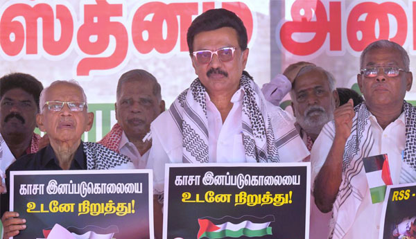 అంతర్జాతీయ హక్కులు, ఐక్యరాజ్యసమితి విధానాలను ఉల్లంఘించి ఇజ్రాయిల్ రక్షణ దళాలు (ఐడిఎఫ్) గాజాపై విచక్షణారహితంగా బాంబు దాడి చేయడం యావత్ ప్రపంచాన్ని కుదిపేసింది. ఈ సమావేశంలో పాల్గొన్న ప్రతి ఒక్కరూ ఇజ్రాయిల్ చేస్తున్న సామూహిక హత్యలను ఖండించారు అని స్టాలిన్ అన్నారు. గాజాపై జరిగిన దాడుల్లో 11 వేల మంది మహిళలు, 17 వేలమంది చిన్నారులు, 175 మంది జర్నలిస్టులు, 125 మంది ఐక్యరాజ్యసమితి ఉద్యోగులు చనిపోయారు. 26 వేల మంది చిన్నారులు తమ తల్లిదండ్రులుల్ని కోల్పోయారు. లక్షమందికిపైగా ప్రజలు గాయాలపాలై ఆసుపత్రుల్లో చికిత్స పొందుతున్నారు. గాజాలో ఎక్కువ భాగం పూర్తిగా నాశనమైంది. అయినప్పటికీ పాలస్తీనా ప్రజలు ఇజ్రాయిల్ దండయాత్రను ప్రతిఘటిస్తూనే ఉన్నారు అని స్టాలిన్ ఈ నిరసన కార్యక్రమంలో చెప్పారు. ఆఖరుకు ఆహారం కోసం ఎదురుచూస్తున్న 45 మందిని ఐడిఎఫ్ చంపిందందని తెలిసి.. ప్రపంచ మానవాళి మండిపడింది. 47 దేశాల నుండి పాలపొడి, ఆహారం, సహాయ సామాగ్రిని తీసుకువెళుతున్న స్వచ్ఛంద సేవలకులను సైతం ఇజ్రాయిల్ సైన్యం అరెస్టు చేసింది. అంతర్జాతీయ చట్టాన్ని ఉల్లంఘించి మరీ ఇజ్రాయిల్ చేస్తున్న ఈ చర్యలను ఖండించకుండా మనం మౌన ప్రేక్షకులుగా ఉండగలమా? అని ఆయన ప్రశ్నించారు.