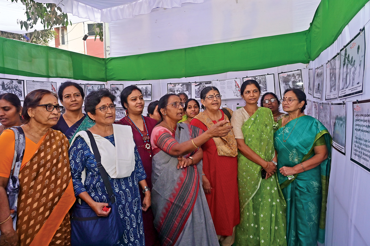 తెలంగాణ సాయుధ రైతాంగ పోరాటంలో కొంగు నడుంకు కట్టి, కొడవళ్లు చేతబట్టి… వెట్టి, స్త్రీ విముక్తి, భూపోరాటాల నుంచి నేడు స్త్రీలు ఎదుర్కొంటున్న సమస్యలను అఖిల భారత ప్రజాతంత్ర మహిళా సంఘం ఐద్వా ఫోటో ఎగ్జిబిషన్ ఆవిష్కరించింది. జనవరి 25 నుంచి 28 వరకు నాలుగు రోజుల పాటు హైదరాబాద్లోని ఆర్టీసీ కళ్యాణ మంటపంలో జరుగనున్న ఐద్వా 14వ జాతీయ మహాసభలను పురస్కరించుకుని శనివారం సుందరయ్య విజ్ఞాన కేంద్రంలో ఏర్పాటు చేసిన చిత్ర ప్రదర్శనను ఆ సంఘం జాతీయ ప్రధాన కార్యదర్శి మరియం ధావలే ప్రారంభించారు. ఆర్ట్ ఎగ్జిబిషన్ హాల్ను ఐద్వా కోశాధికారి ఎస్..పుణ్యవతి, సాయుధ పోరాటాల చిత్రమాలిక హాల్ను సుధా సింధూరన్ ప్రారంభించారు.
